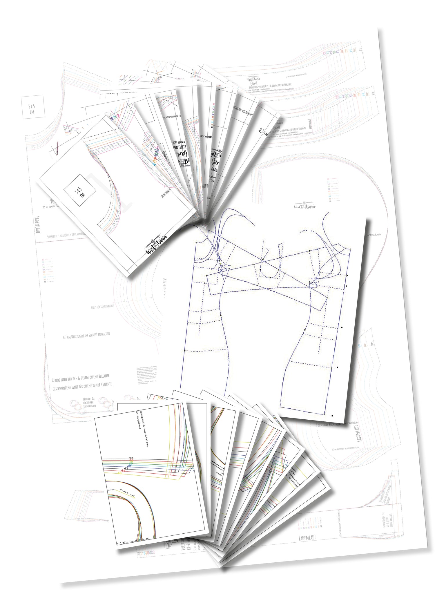 Alle Schnittmuster liegen im Format A4 und A0 vor. So können Schnittmuster in A0 problemlos geplottet werden. Außerdem ist es möglich, die A0 Dateien mit einem Beamer zu verwenden.