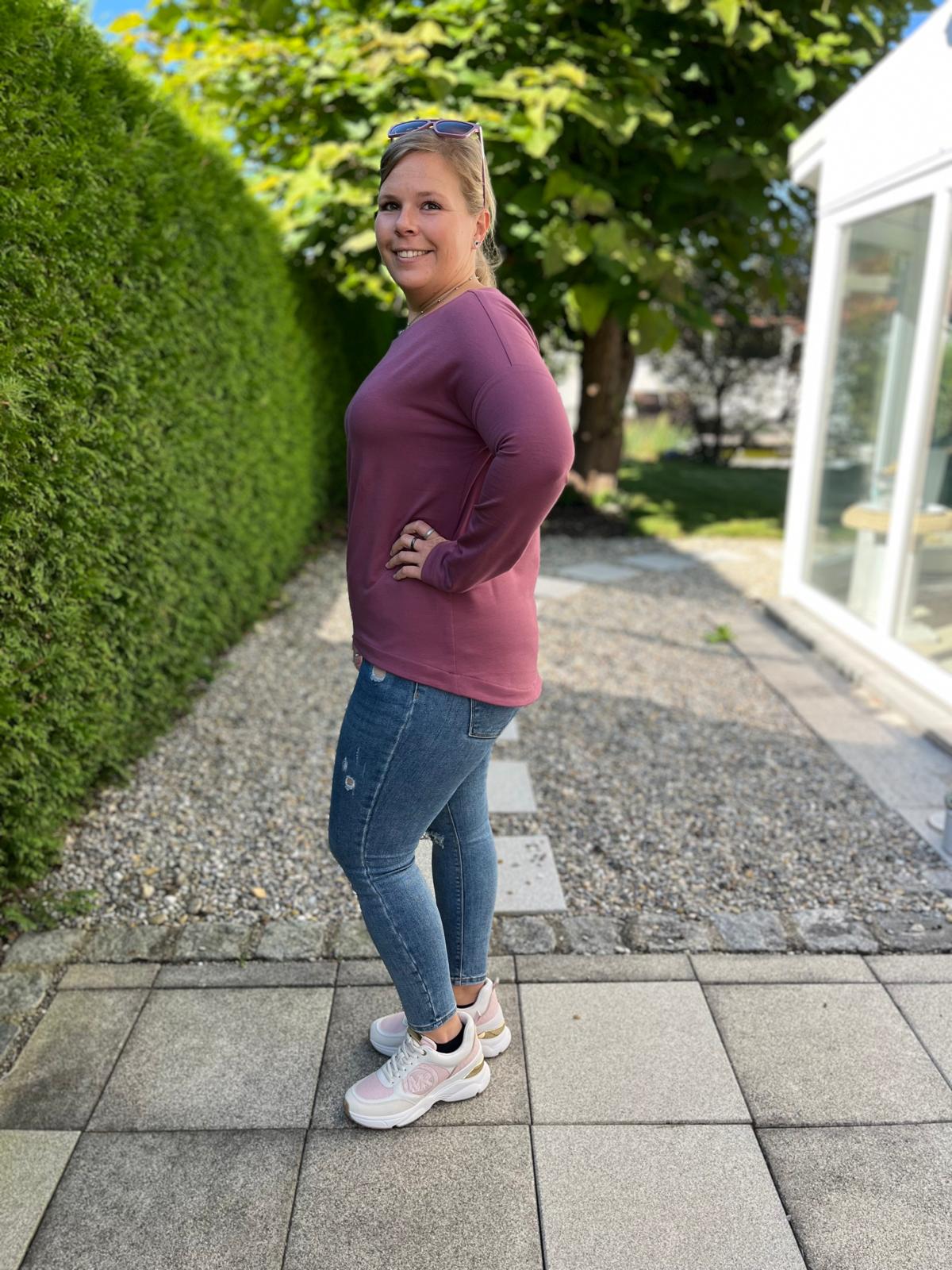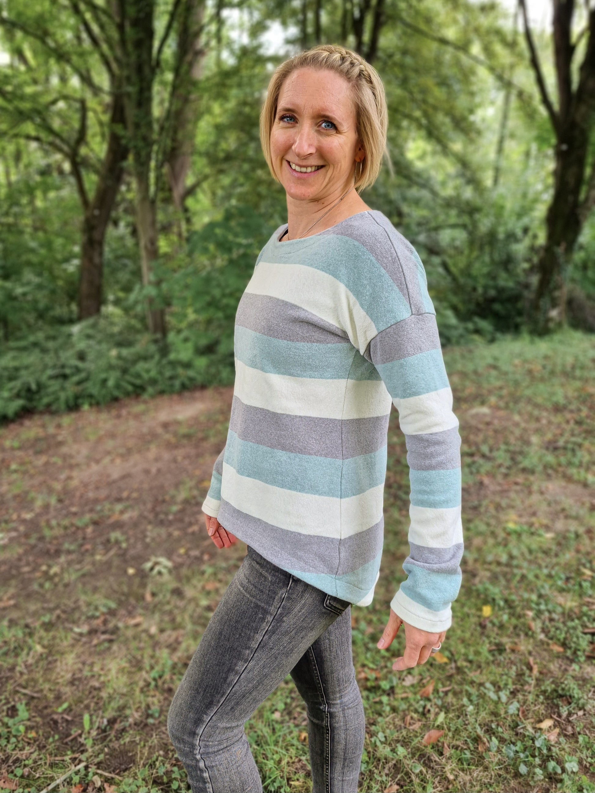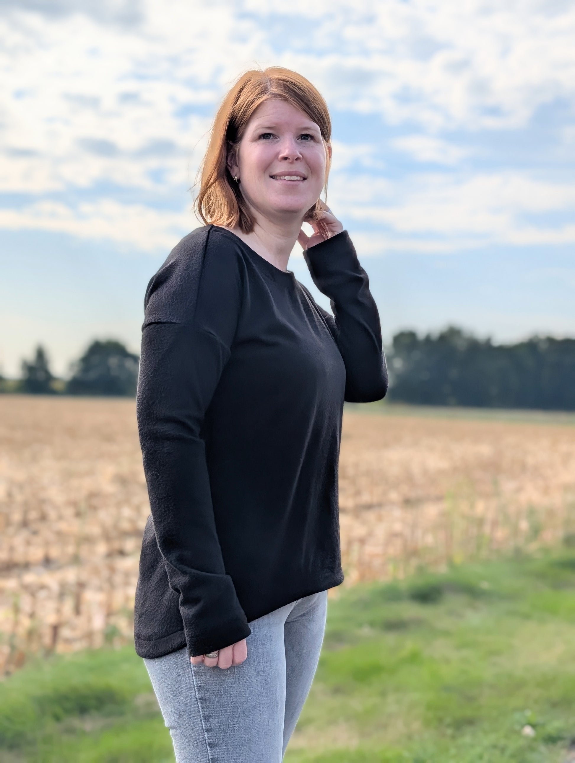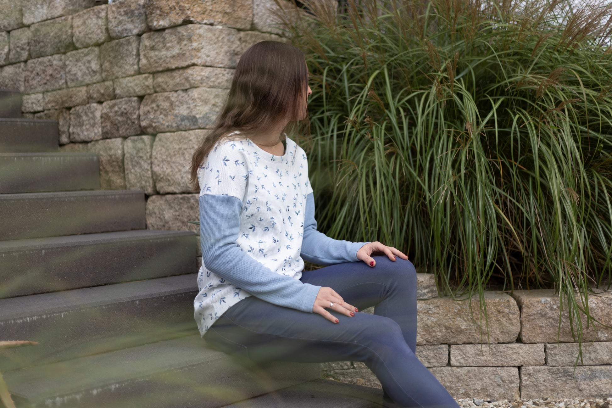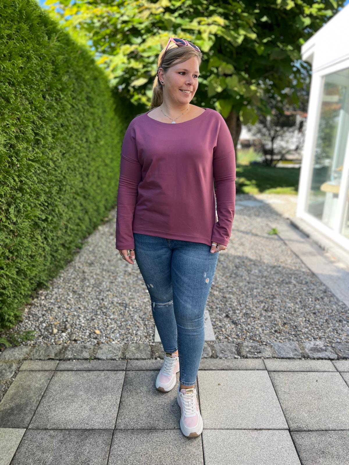 Der Schnitt ist ausgelegt auf Stoffe wie French Terry, Strickstoffe, Waffelstrick, festere Baumwolljerseys und Jacquard-Stoffe.