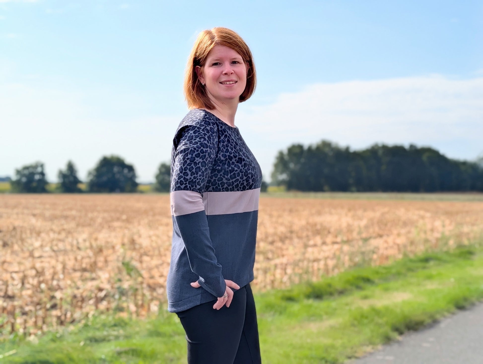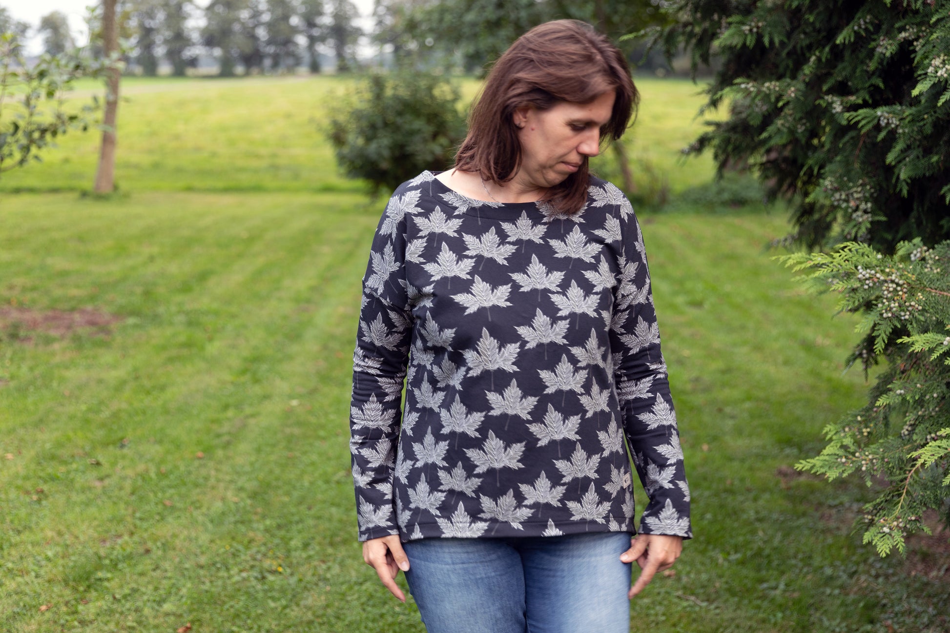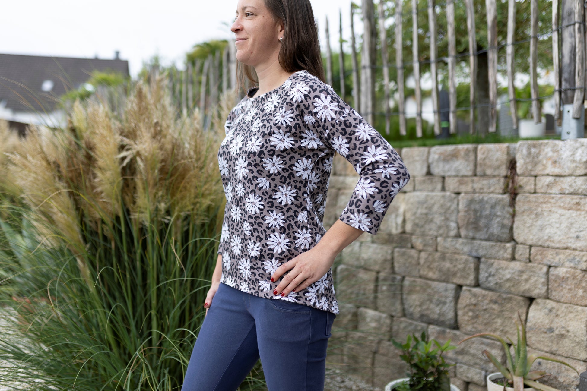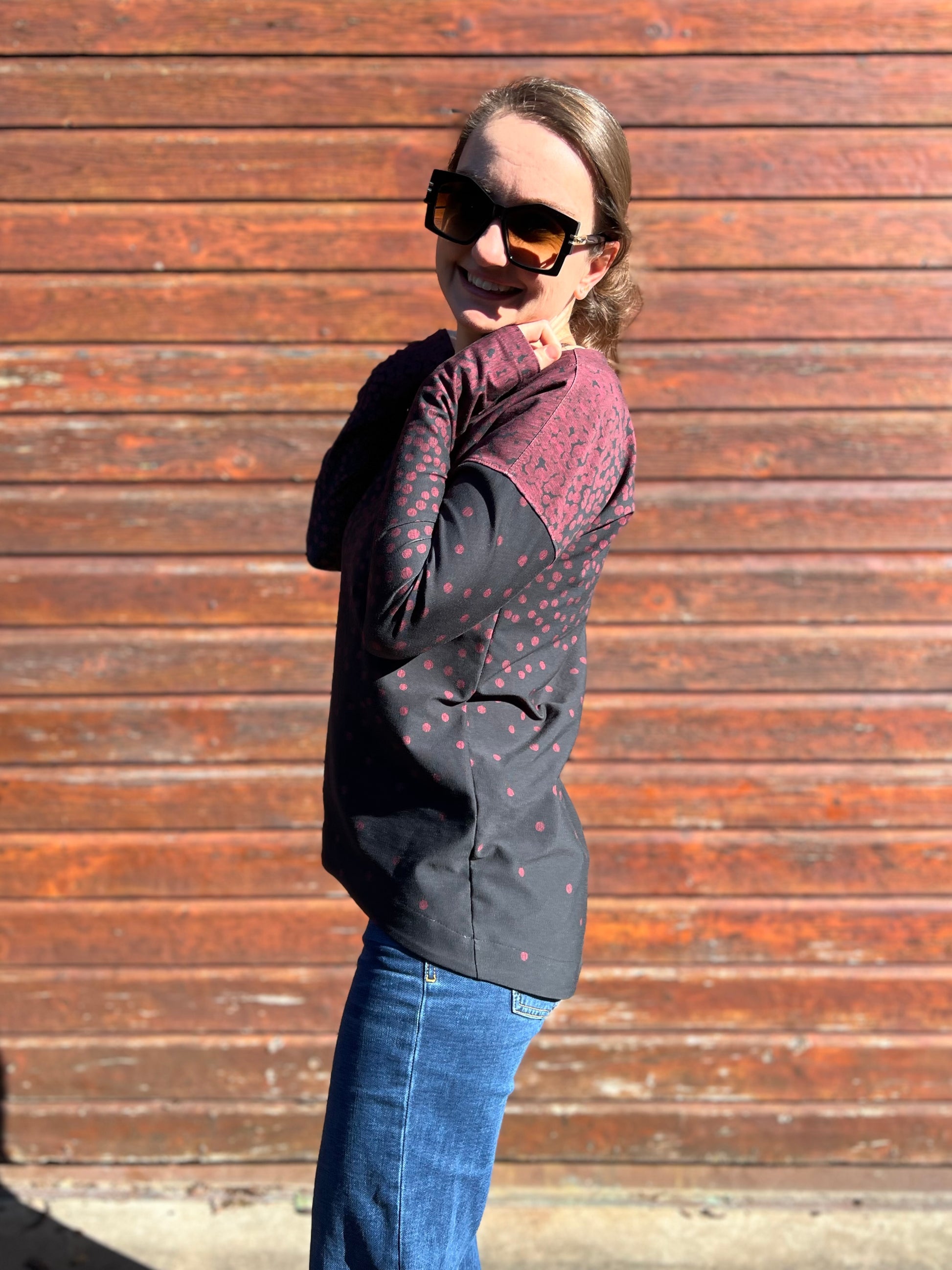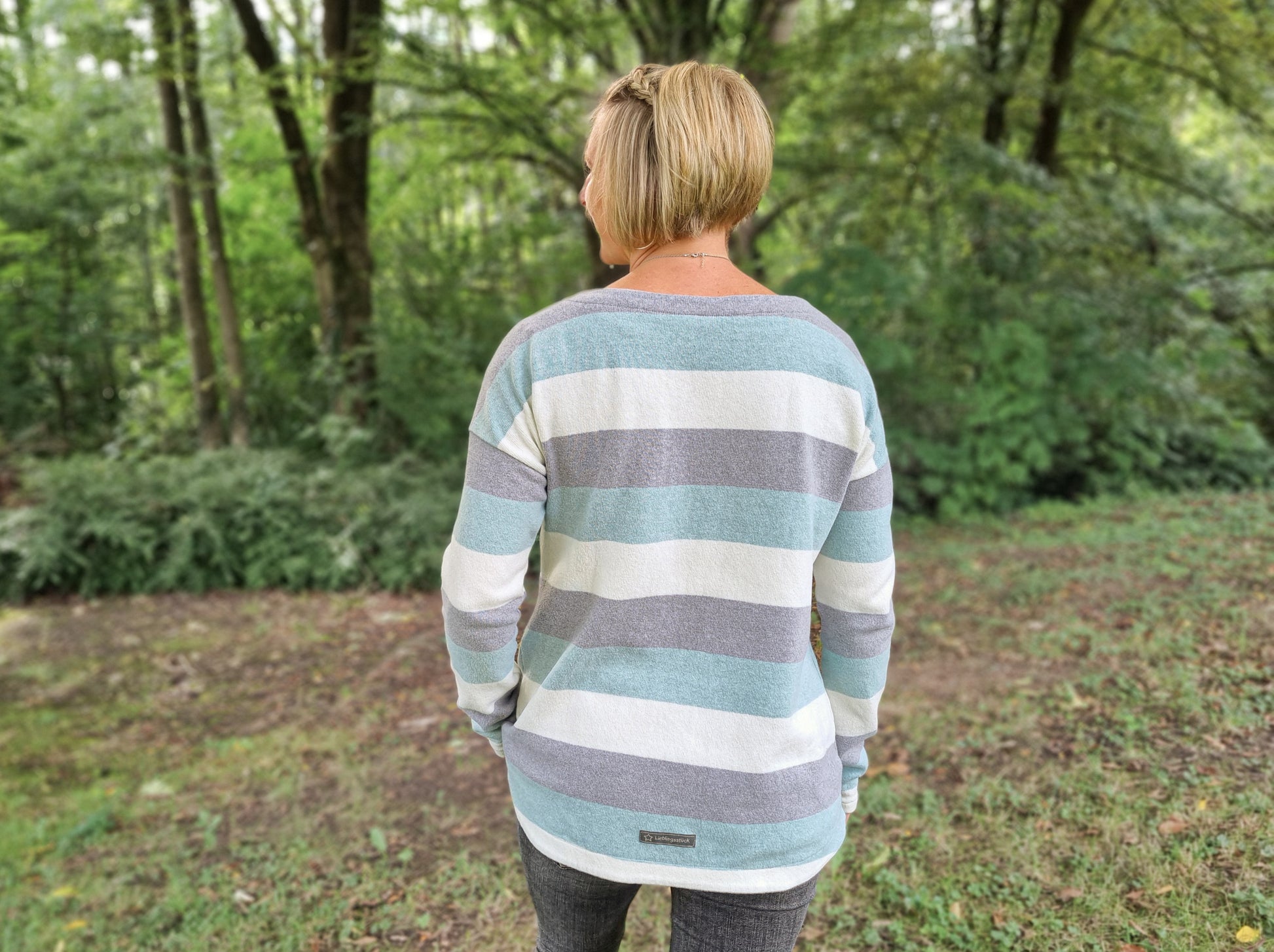 Der Schnitt ist ausgelegt auf Stoffe wie French Terry, Strickstoffe, Waffelstrick, festere Baumwolljerseys und Jacquard-Stoffe.