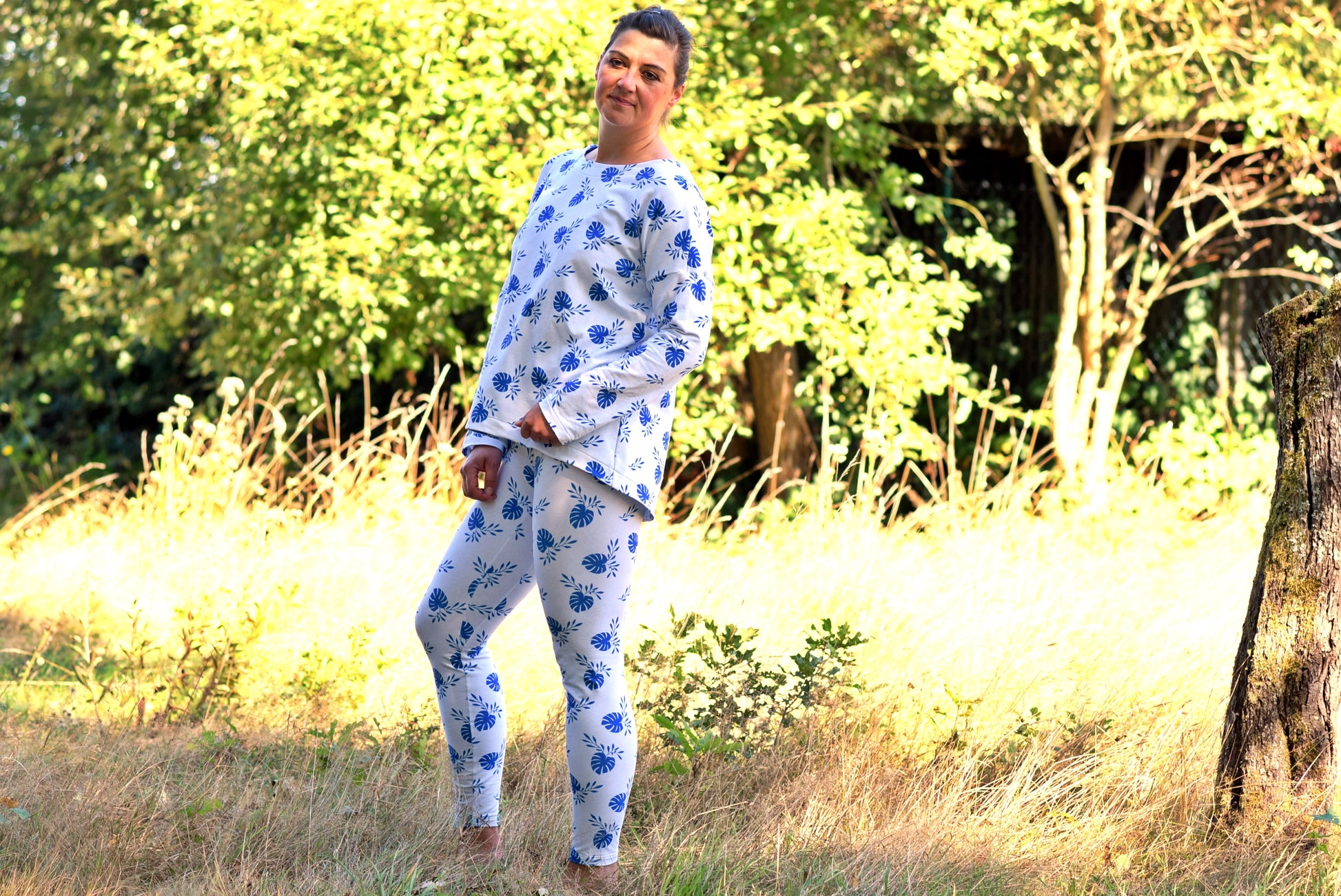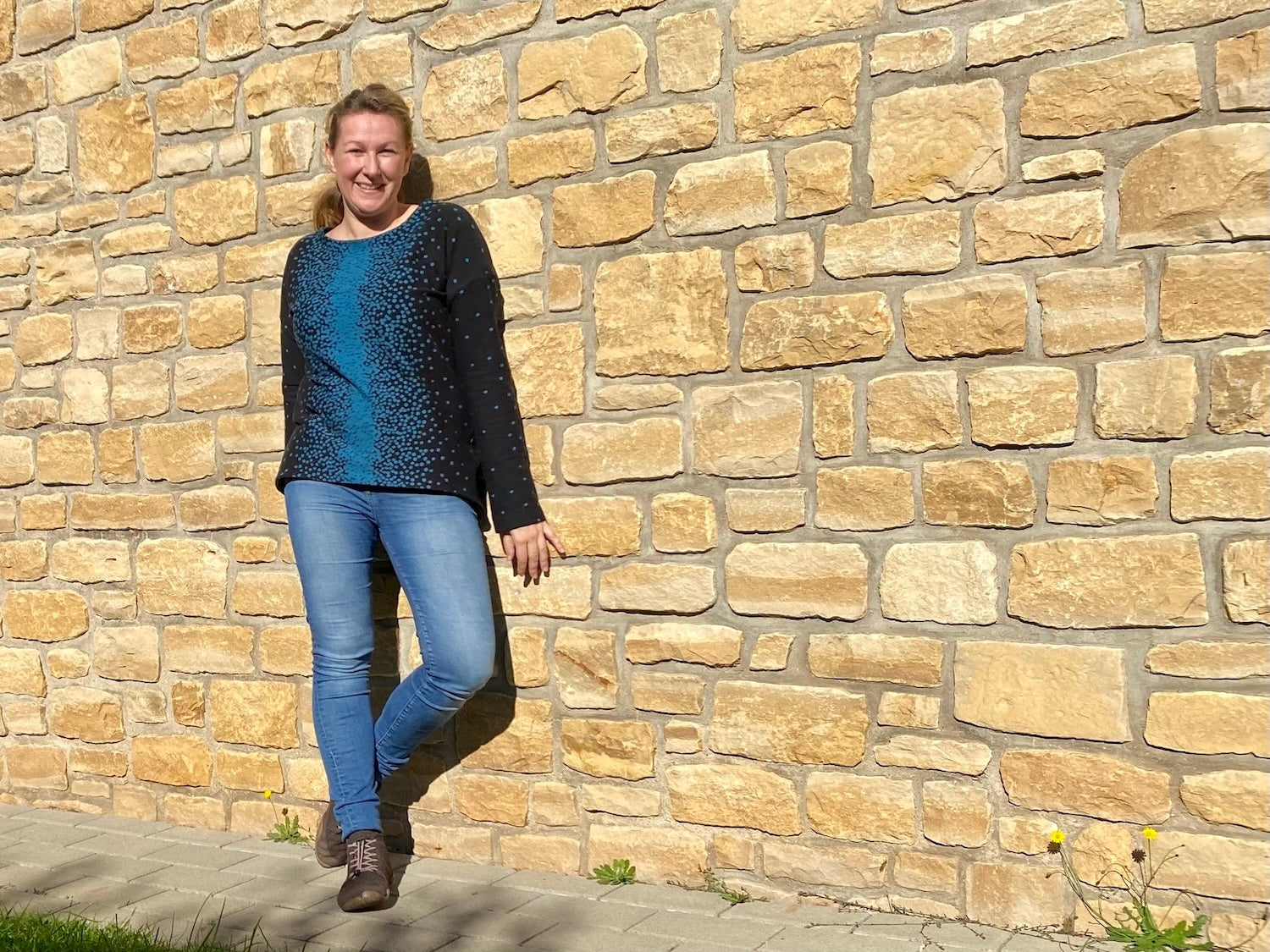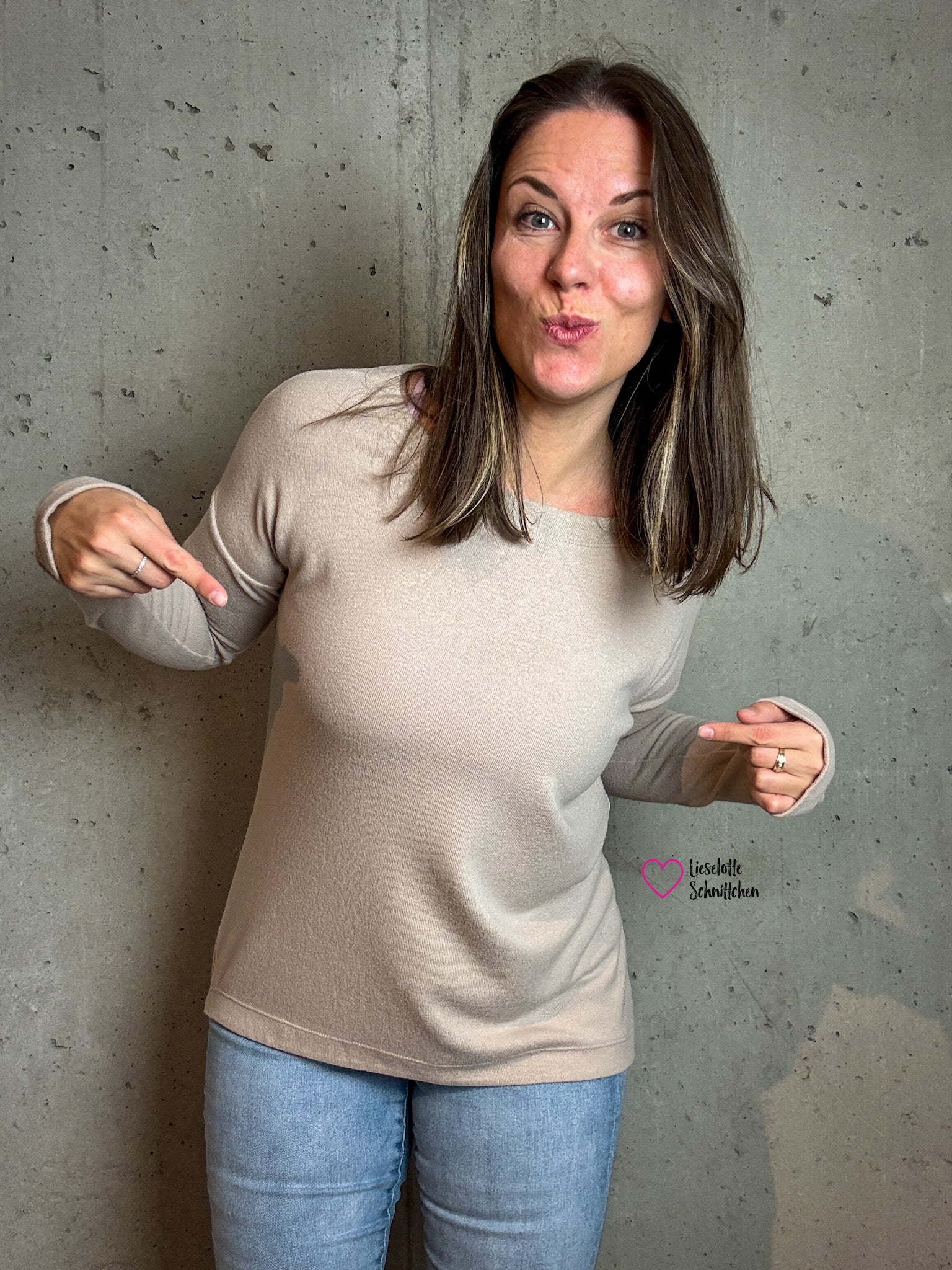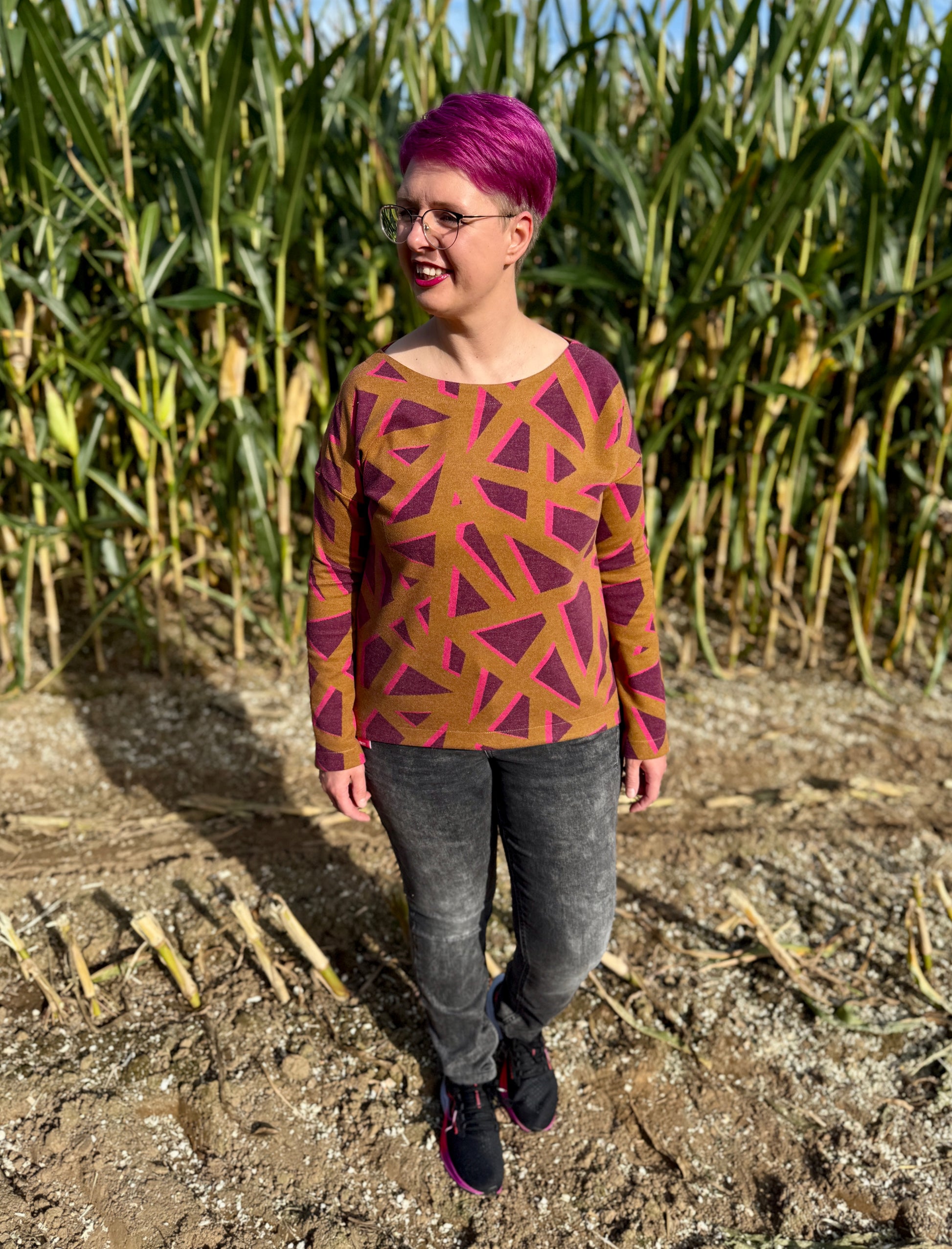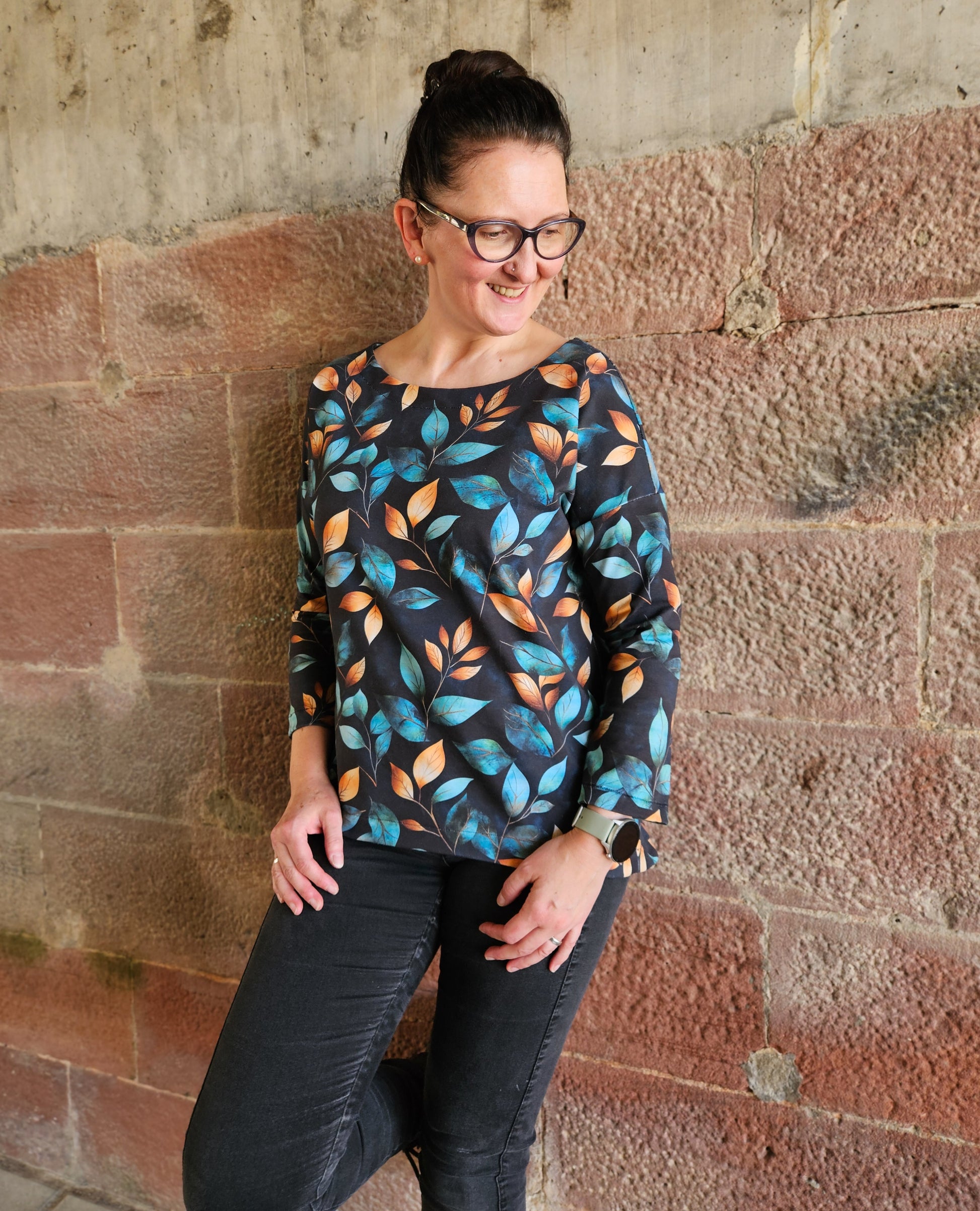 Der Schnitt ist ausgelegt auf Stoffe wie French Terry, Strickstoffe, Waffelstrick, festere Baumwolljerseys und Jacquard-Stoffe.