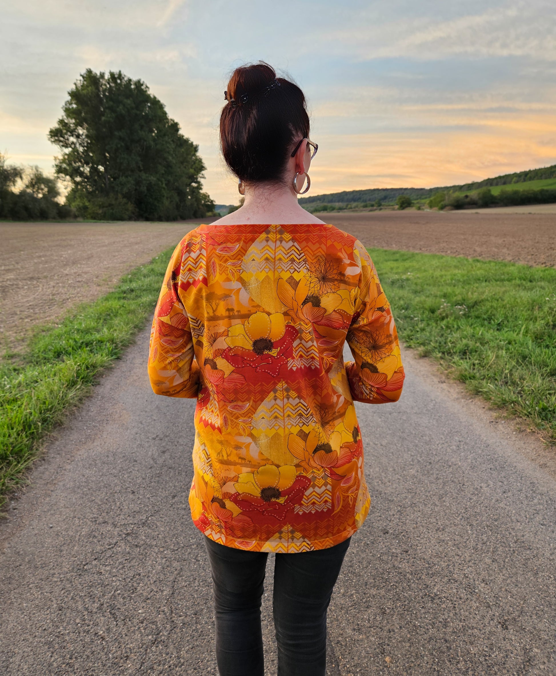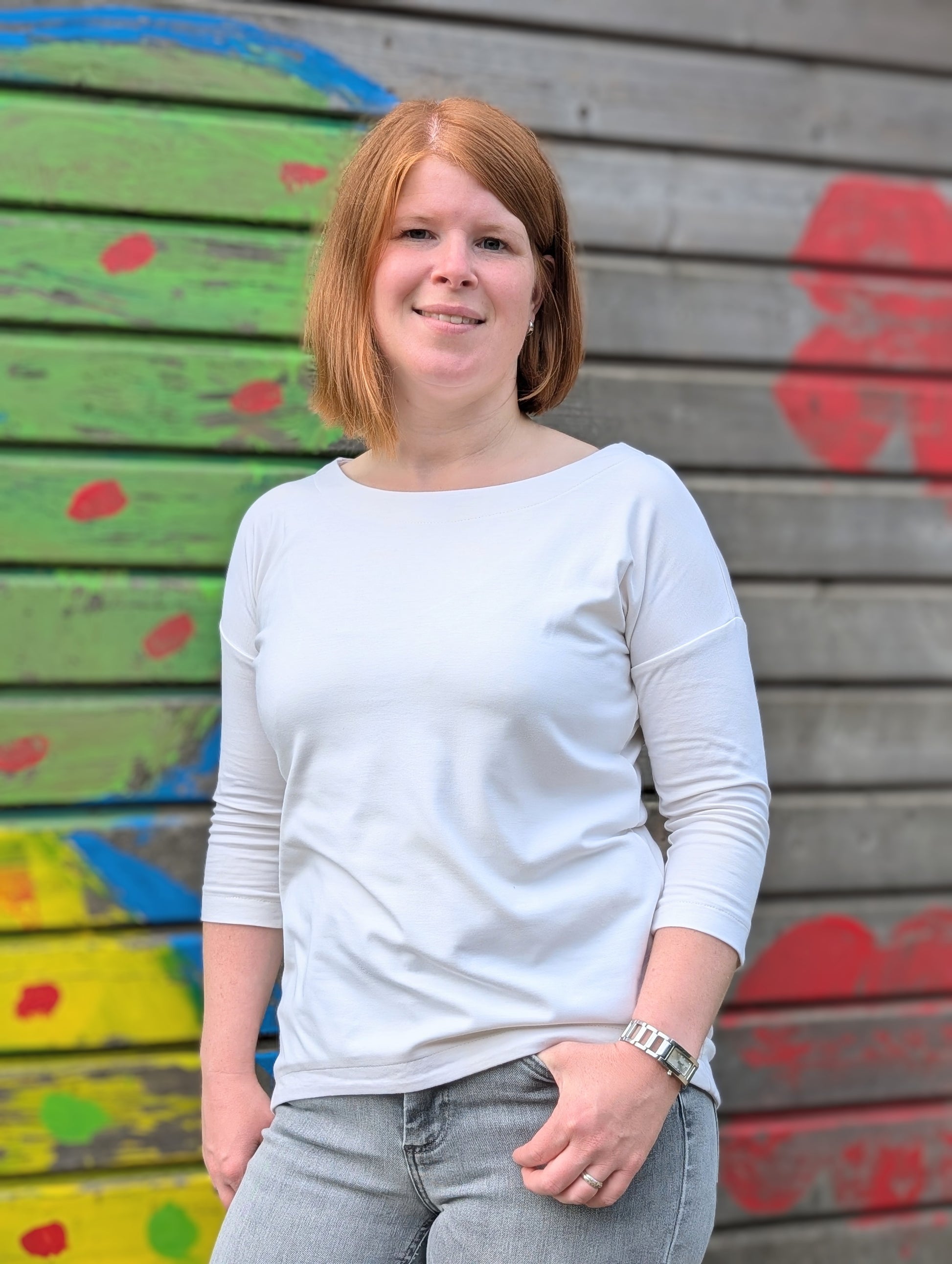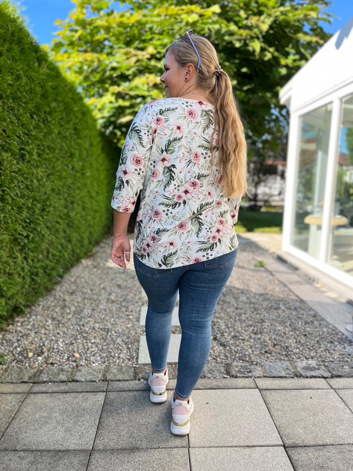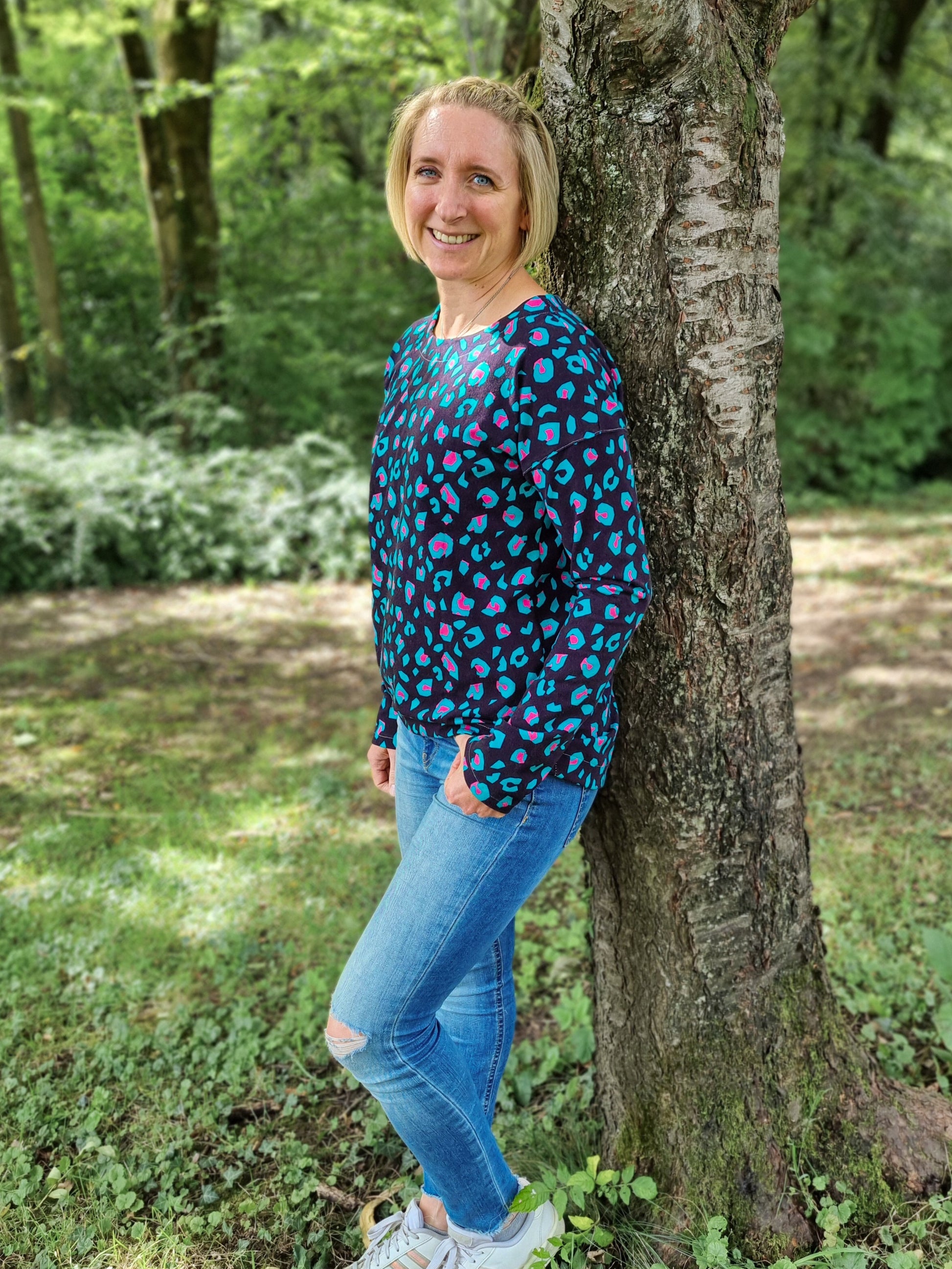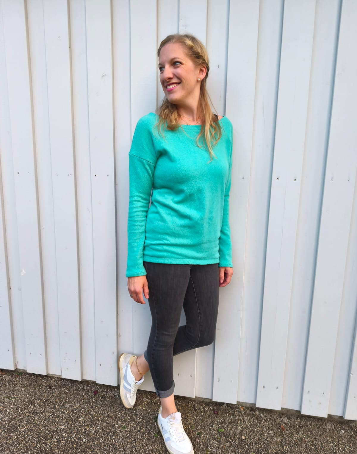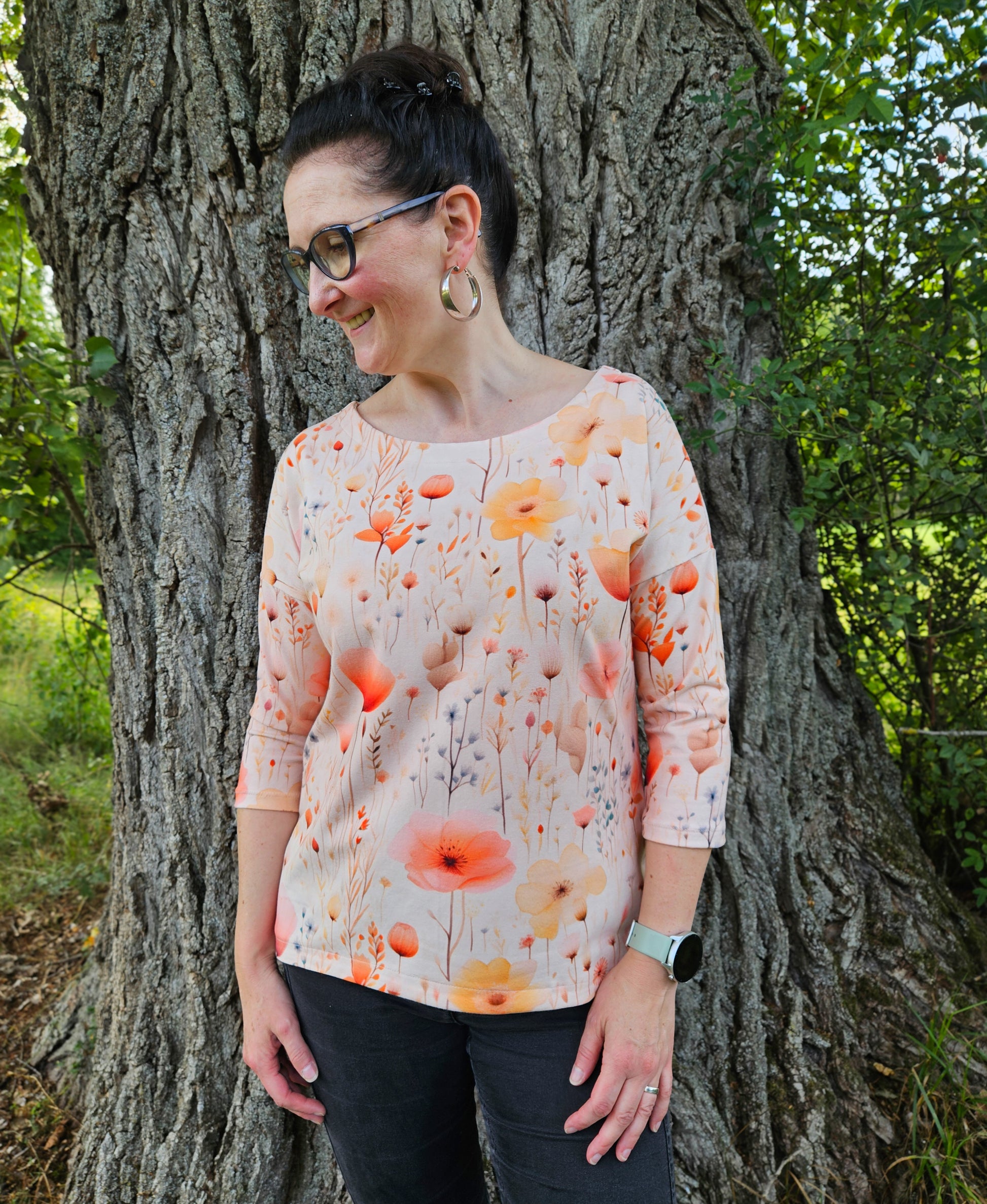 Der Schnitt ist ausgelegt auf Stoffe wie French Terry, Strickstoffe, Waffelstrick, festere Baumwolljerseys und Jacquard-Stoffe.