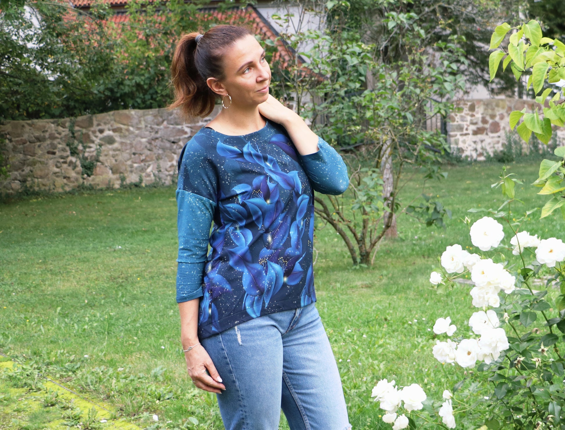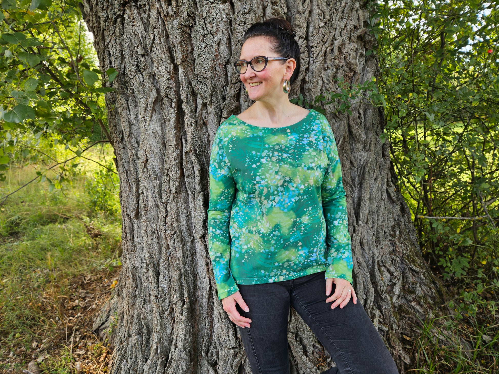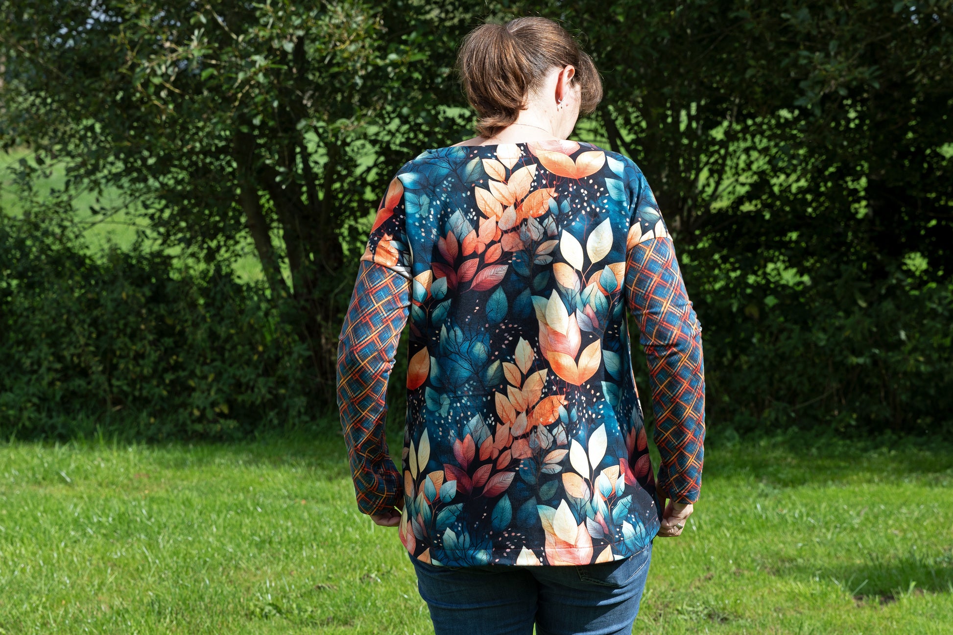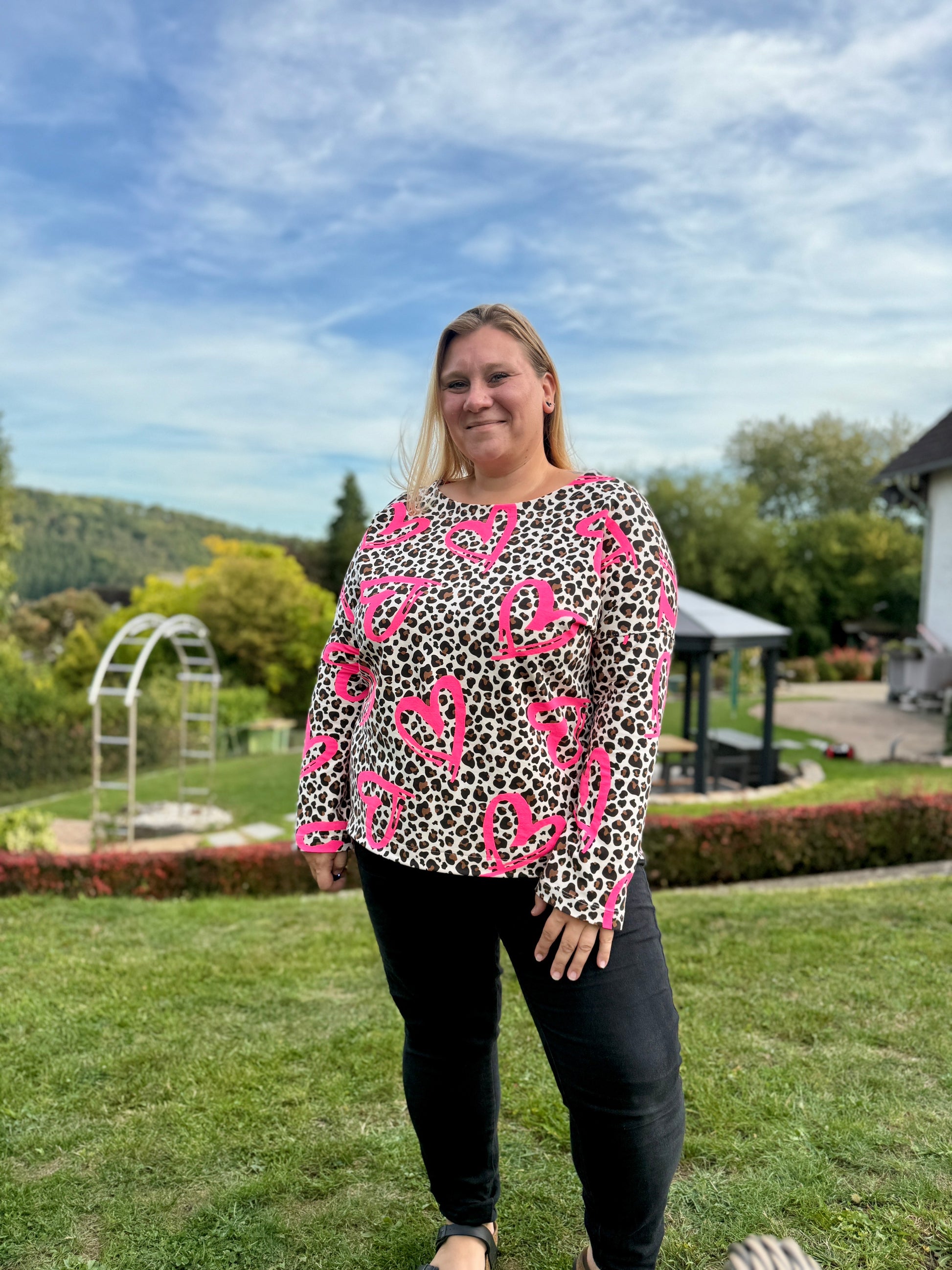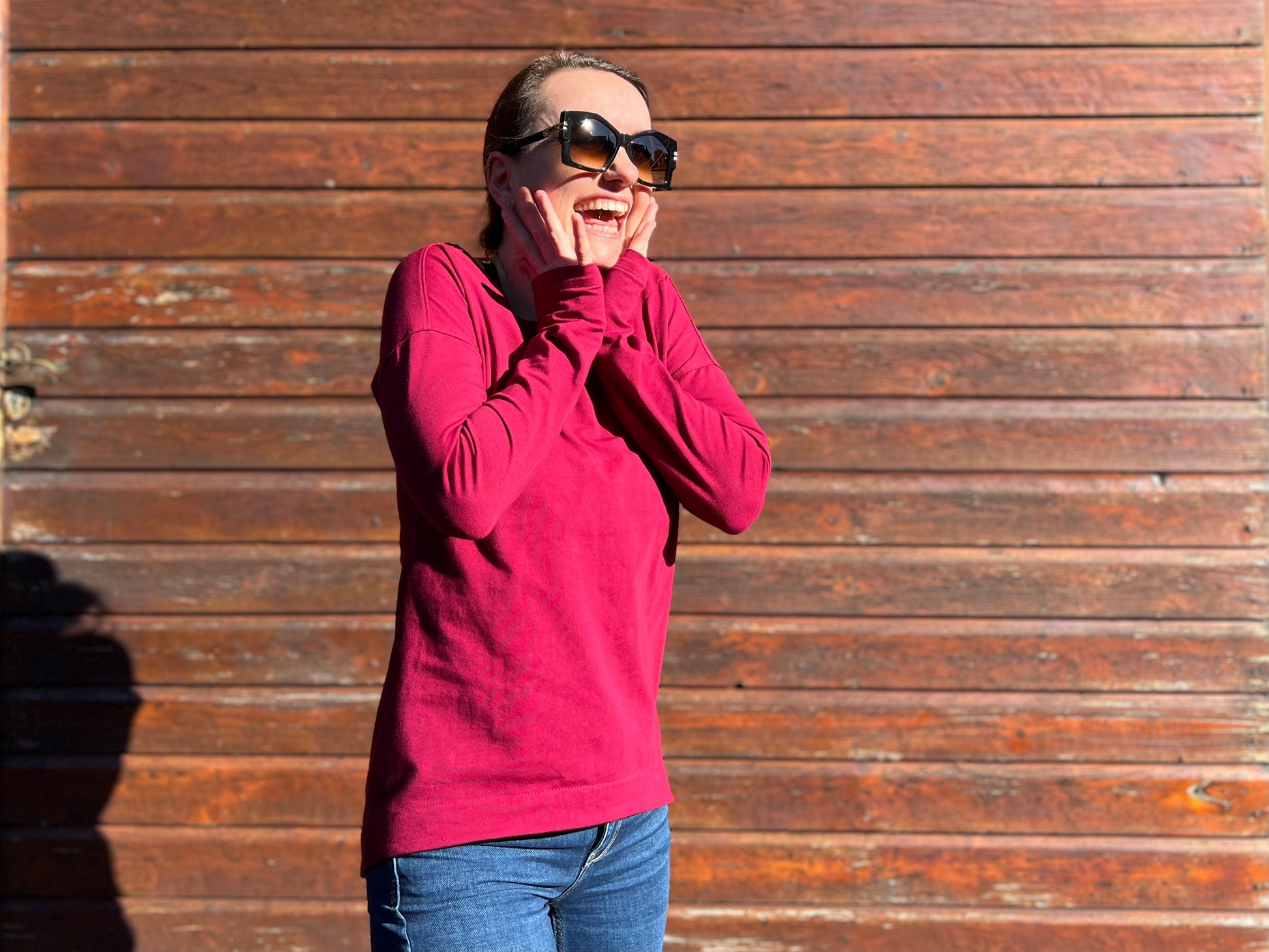 Der Schnitt ist ausgelegt auf Stoffe wie French Terry, Strickstoffe, Waffelstrick, festere Baumwolljerseys und Jacquard-Stoffe.
