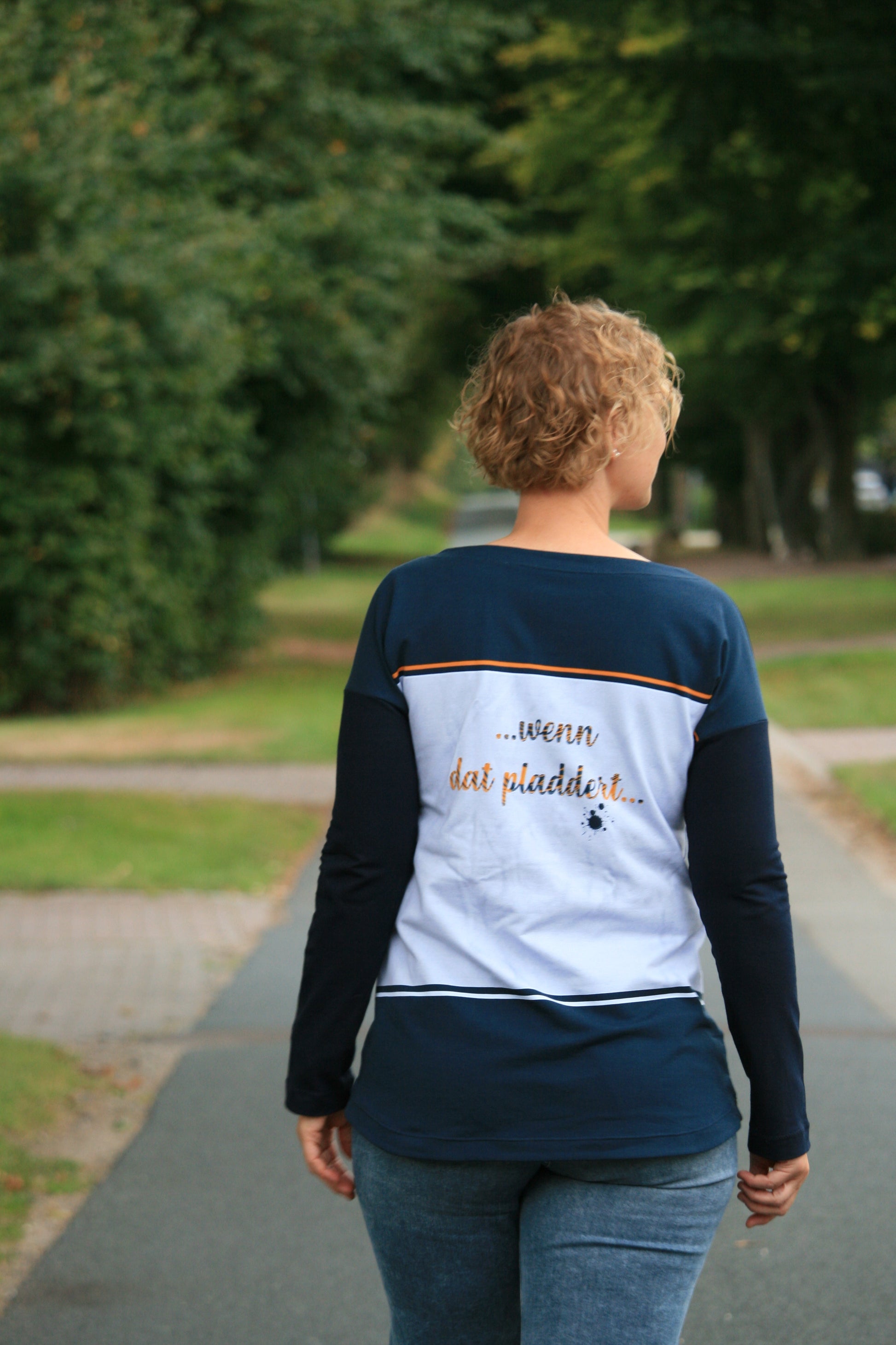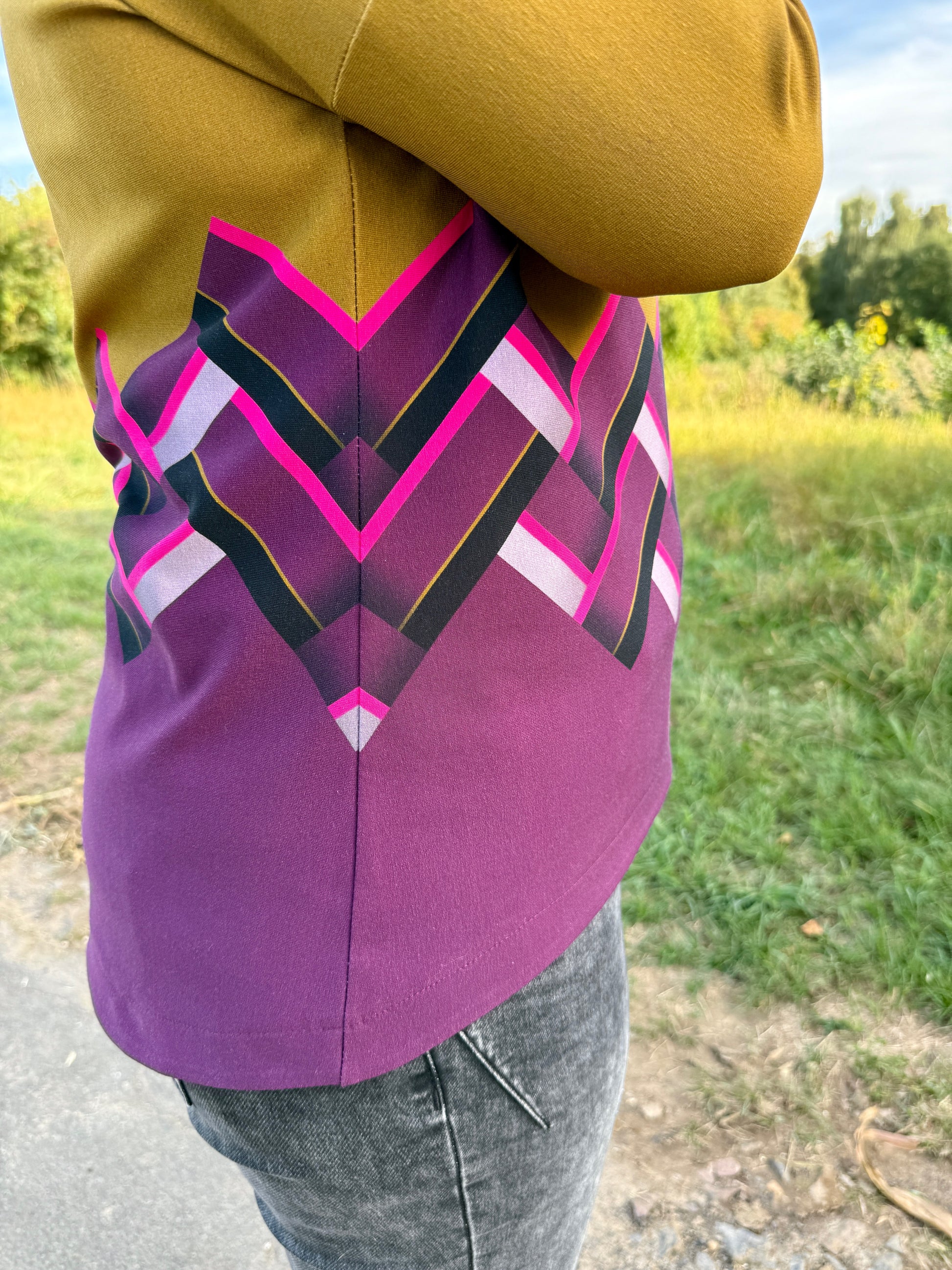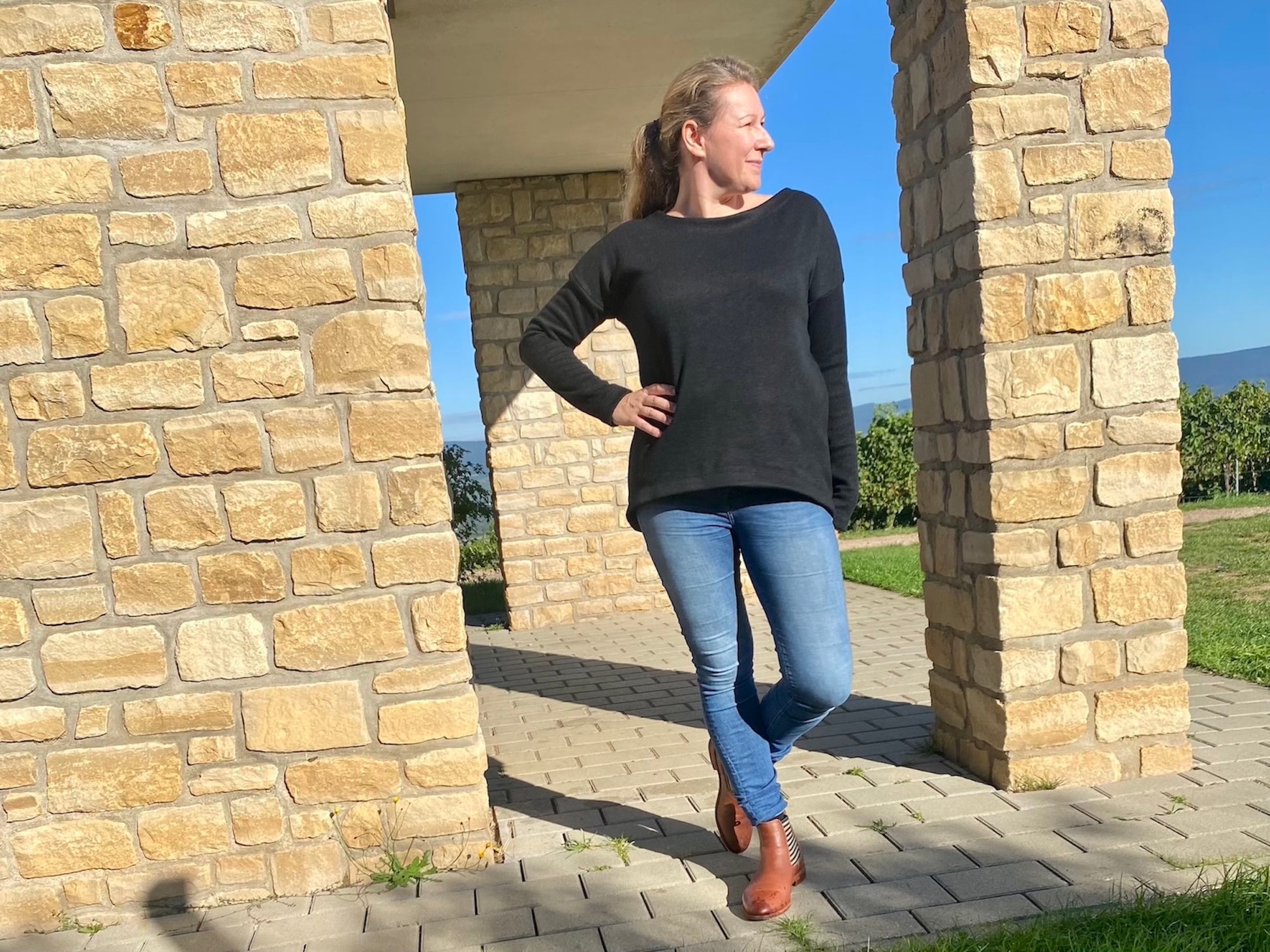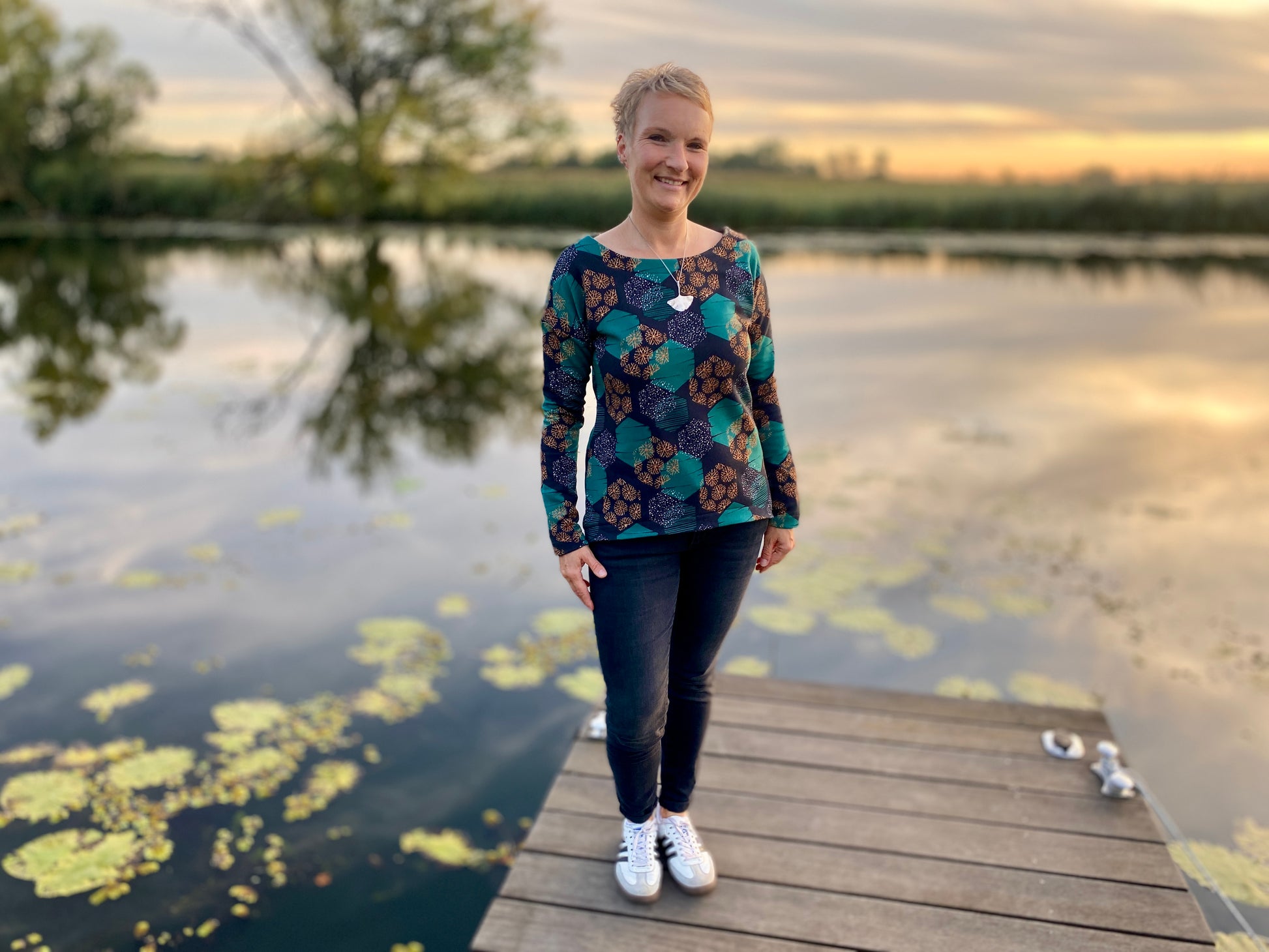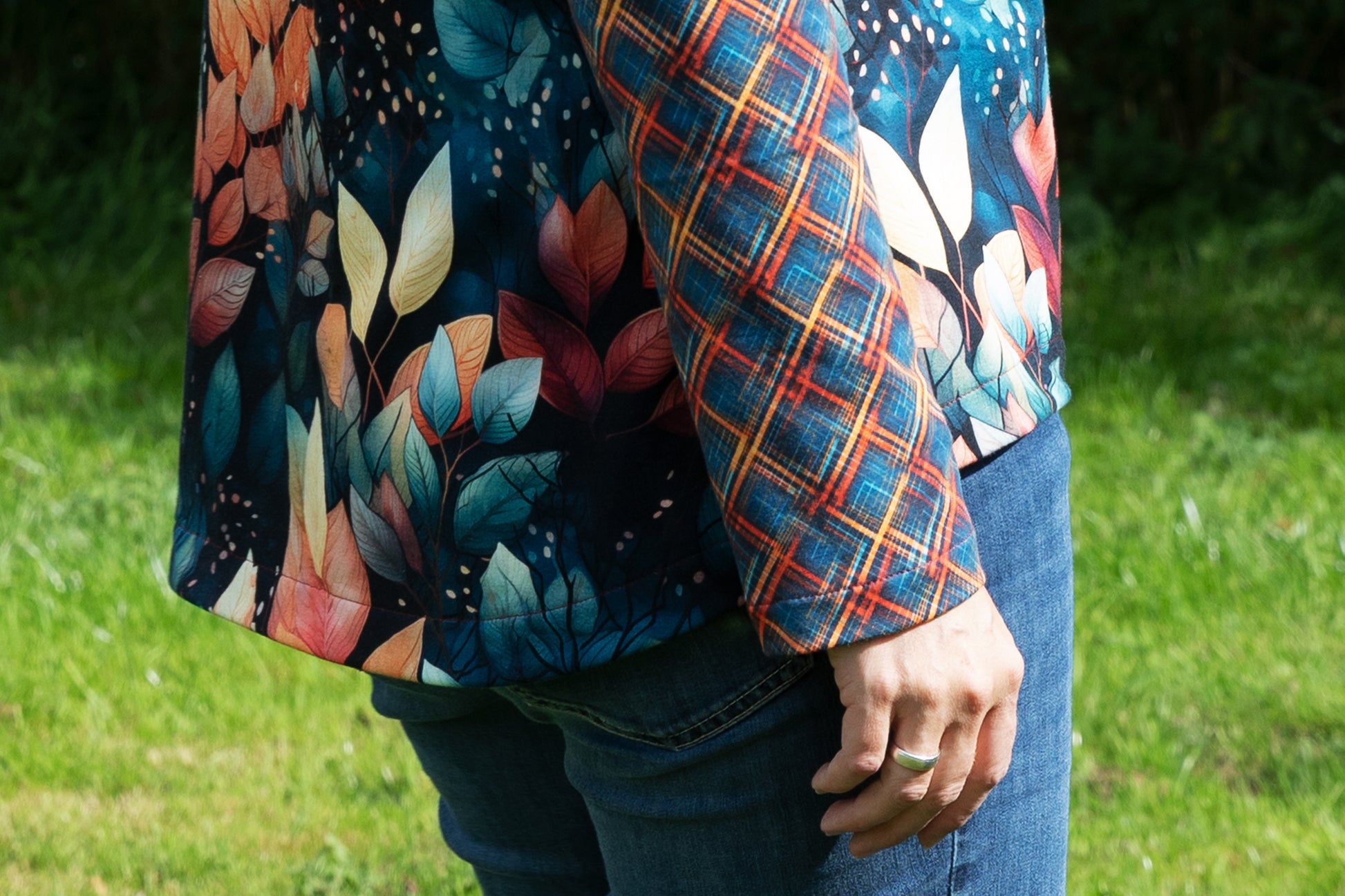 Der Schnitt ist ausgelegt auf Stoffe wie French Terry, Strickstoffe, Waffelstrick, festere Baumwolljerseys und Jacquard-Stoffe.
