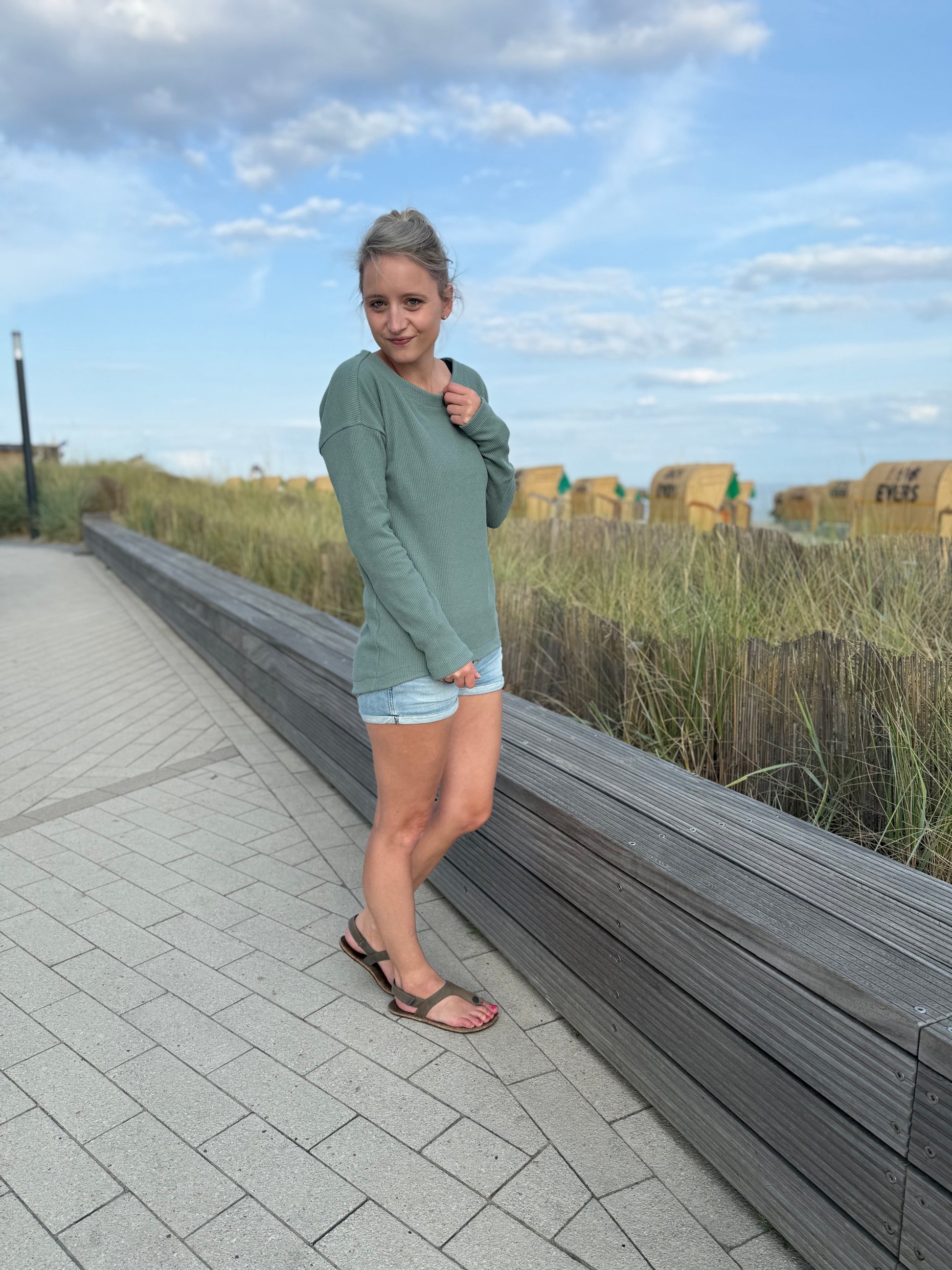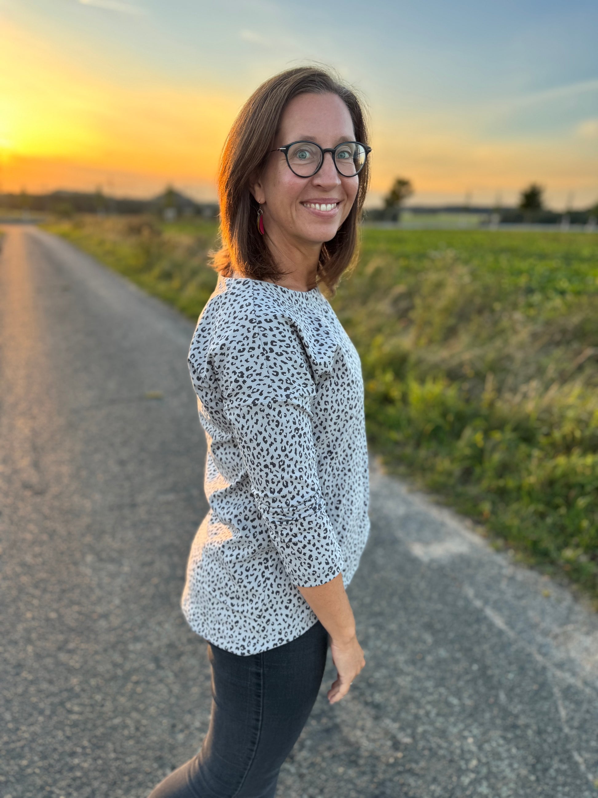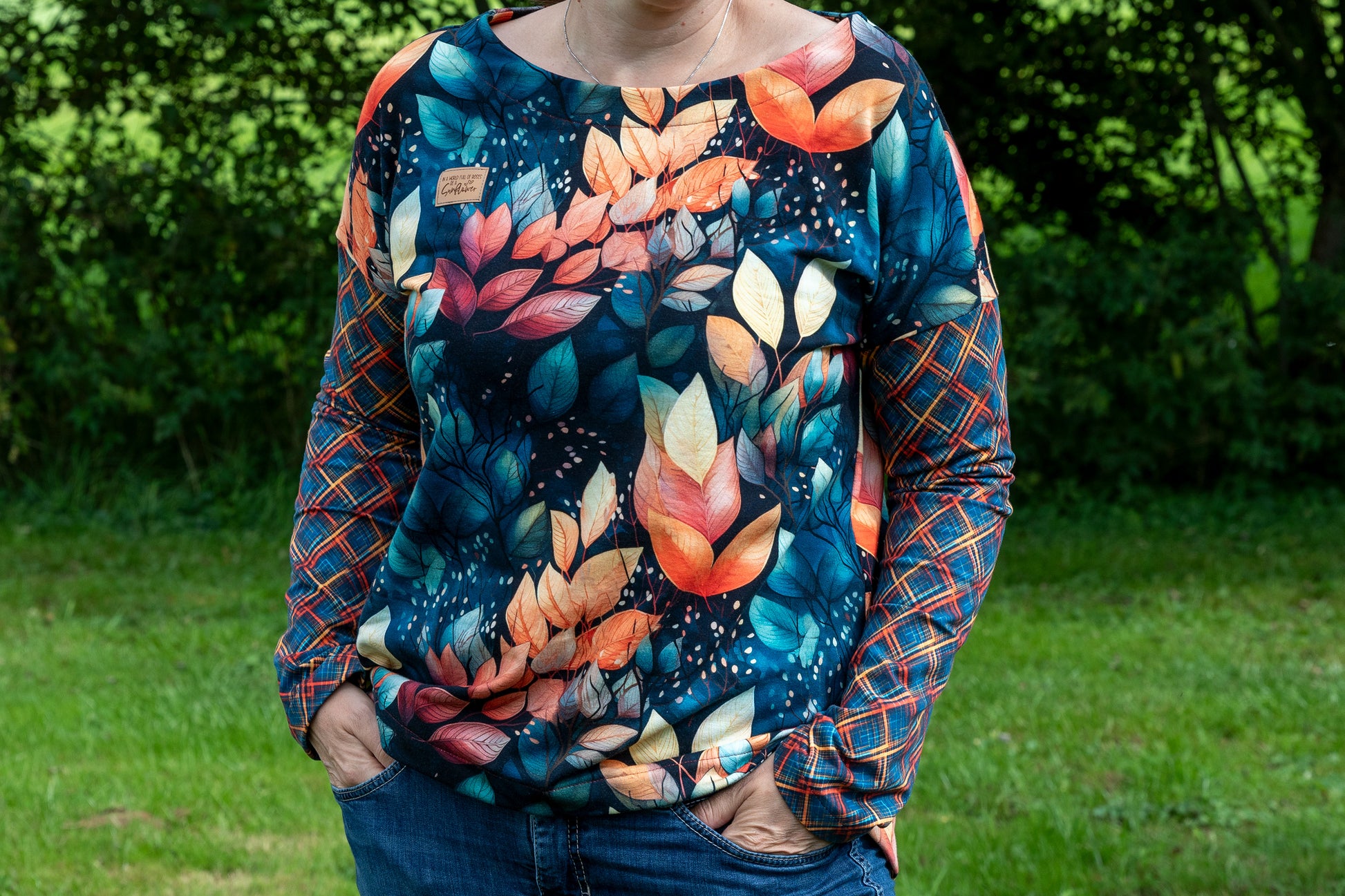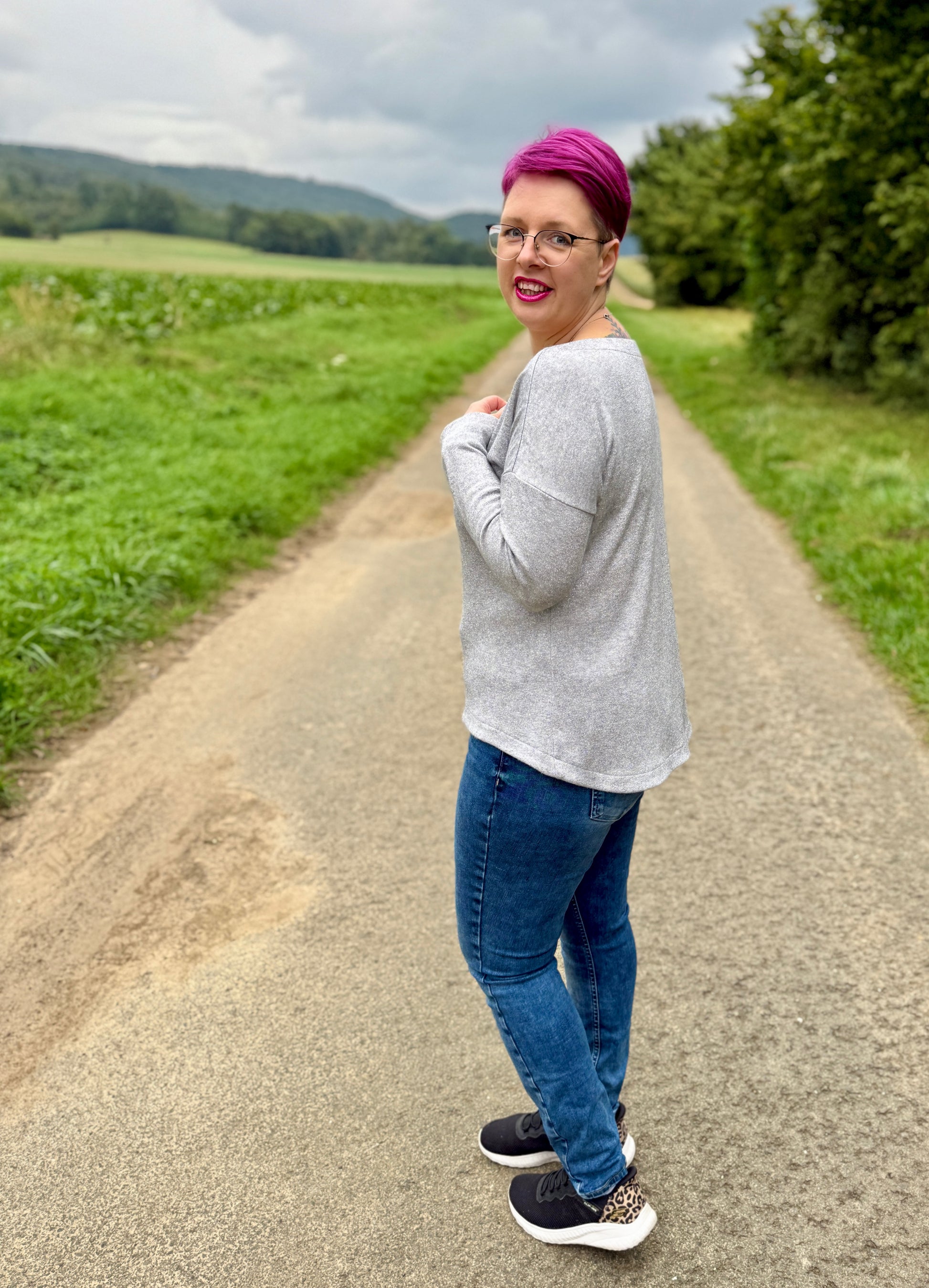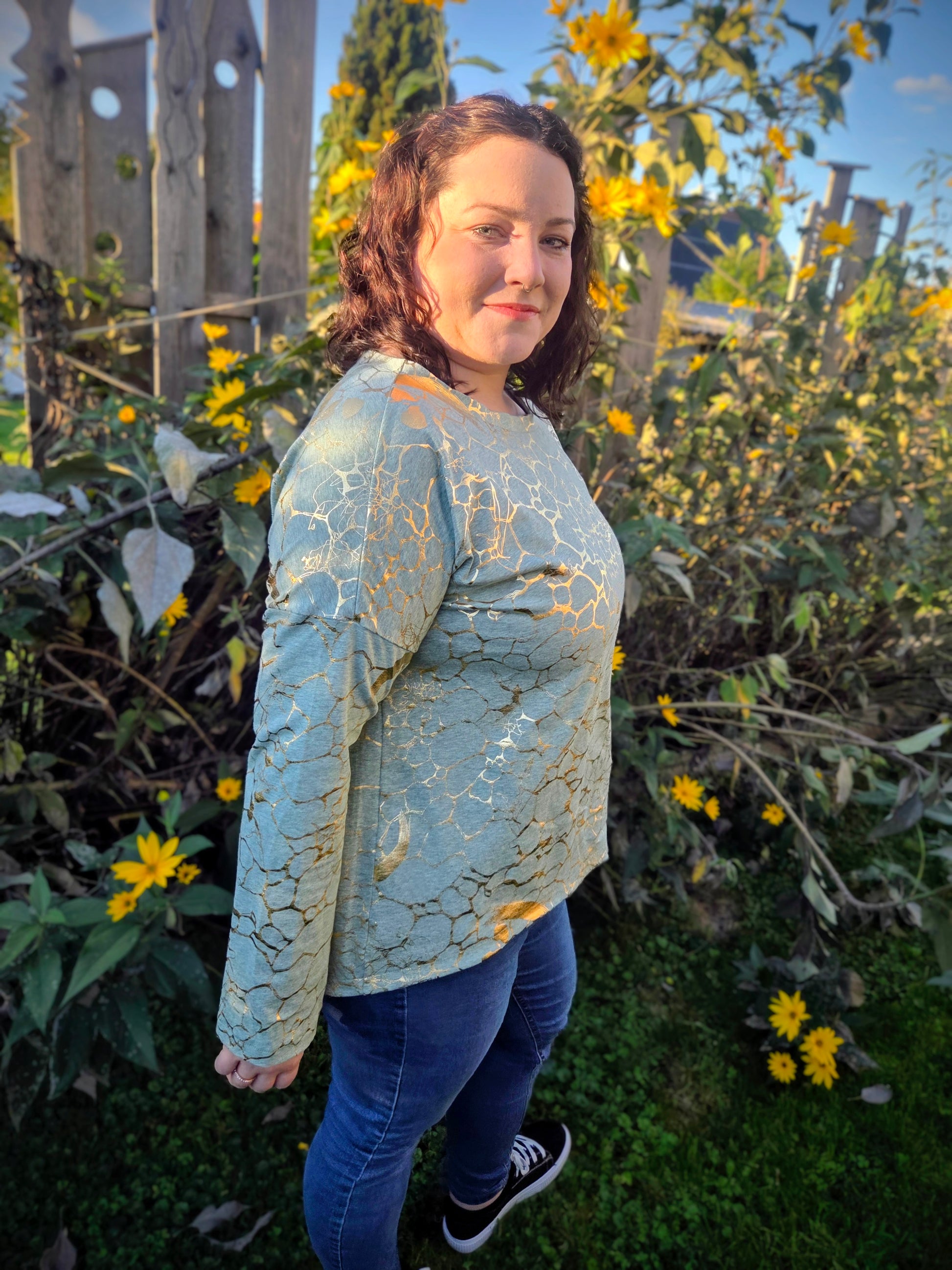 Der Schnitt ist ausgelegt auf Stoffe wie French Terry, Strickstoffe, Waffelstrick, festere Baumwolljerseys und Jacquard-Stoffe.