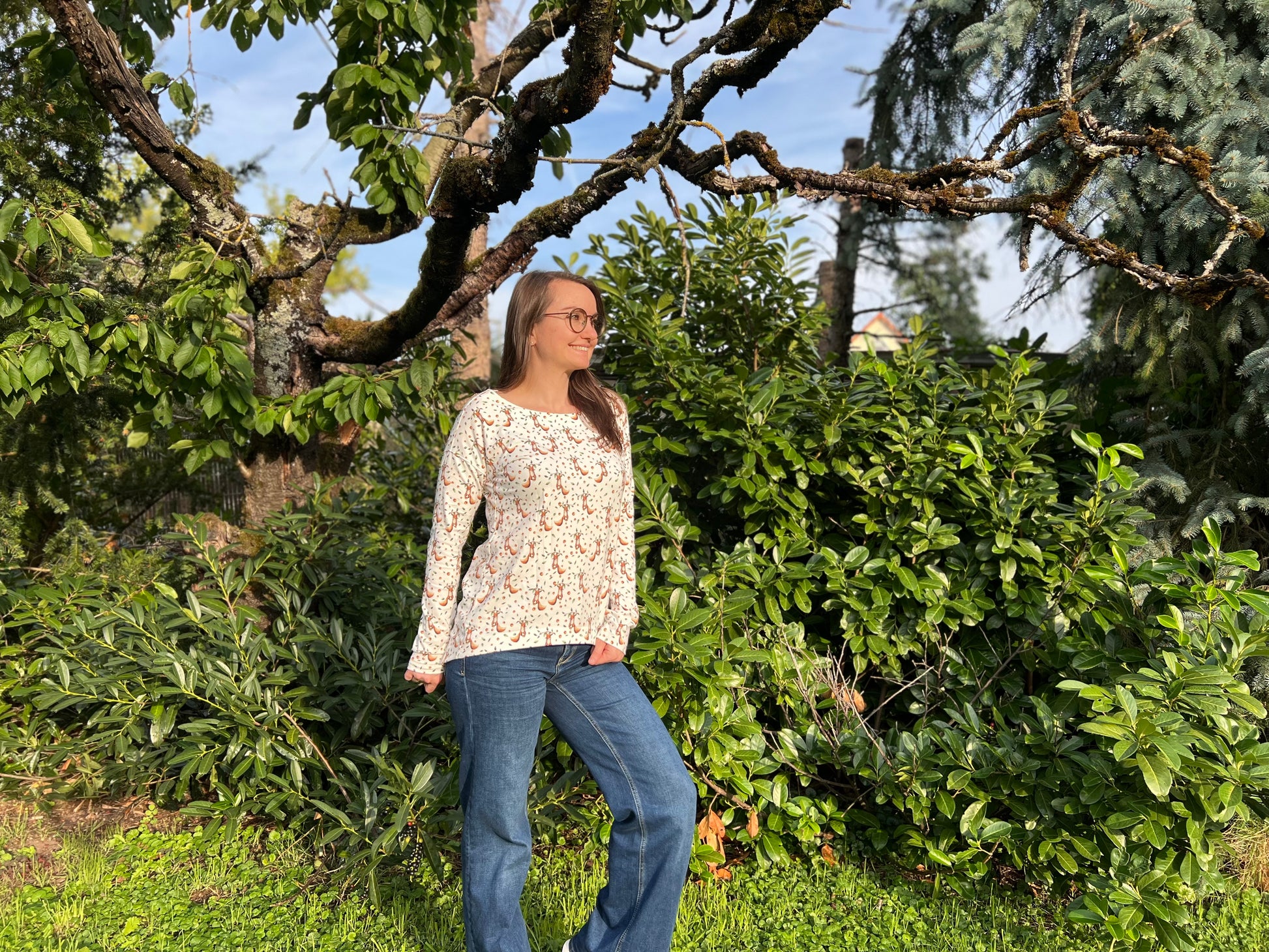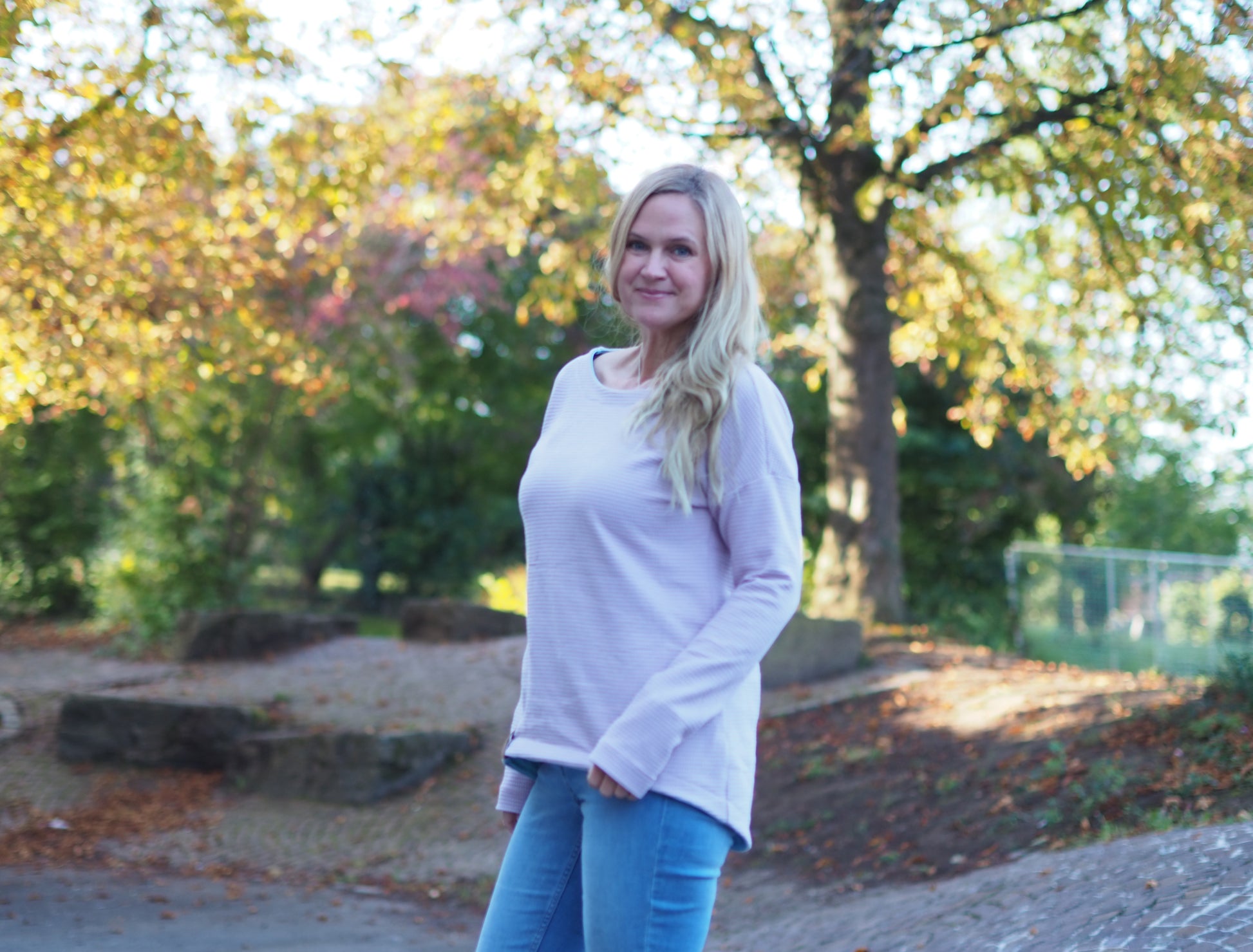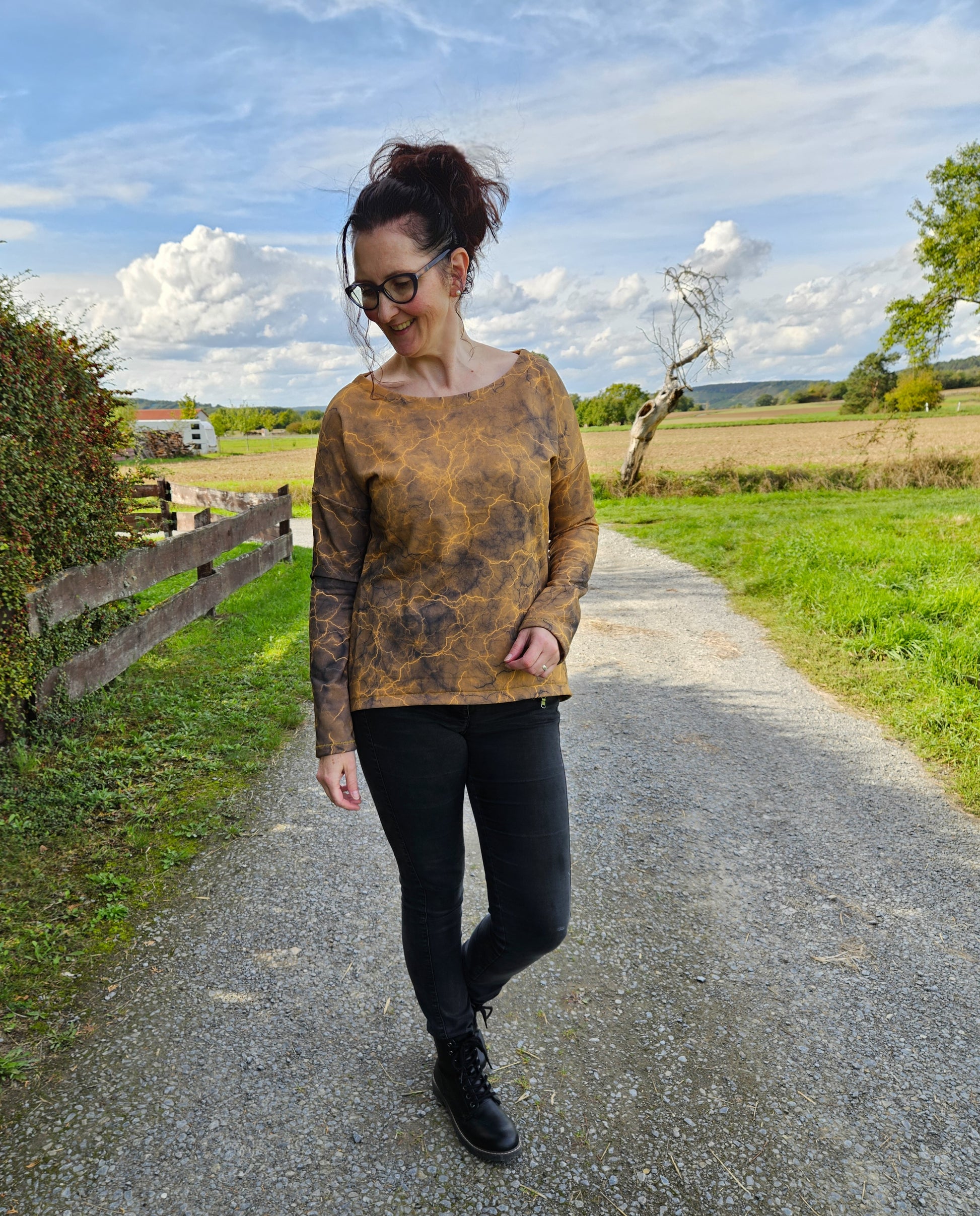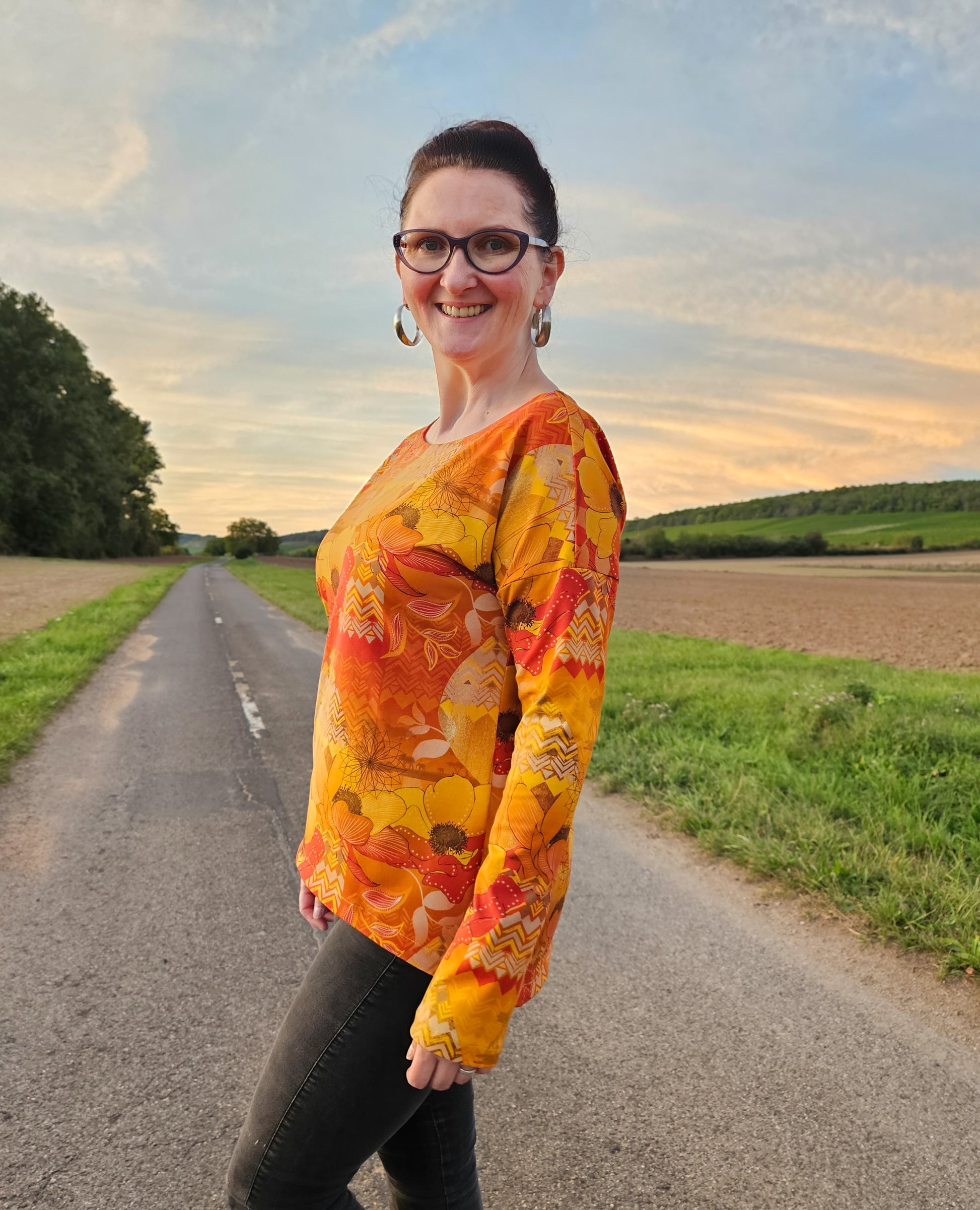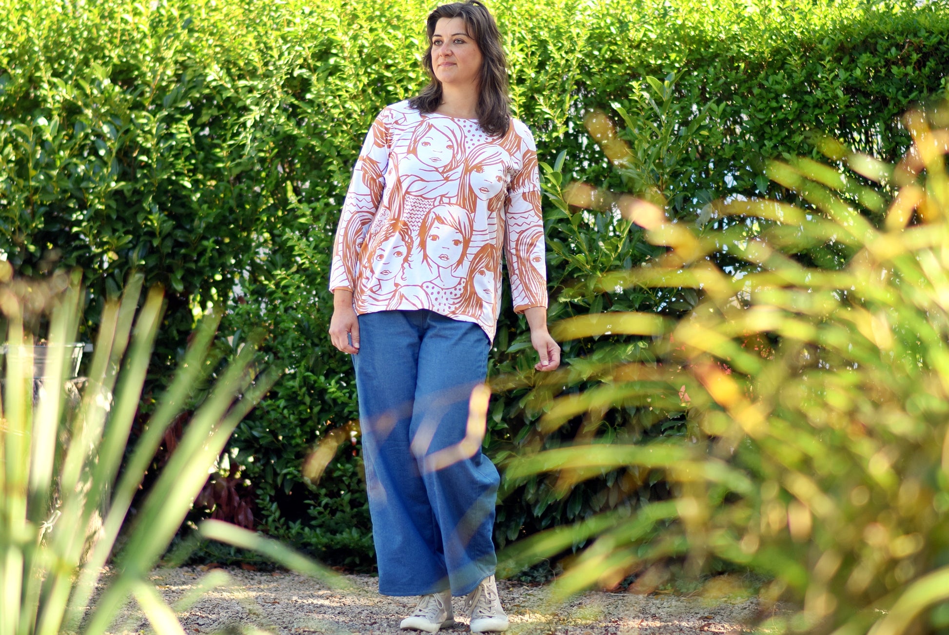 Der Schnitt ist ausgelegt auf Stoffe wie French Terry, Strickstoffe, Waffelstrick, festere Baumwolljerseys und Jacquard-Stoffe.