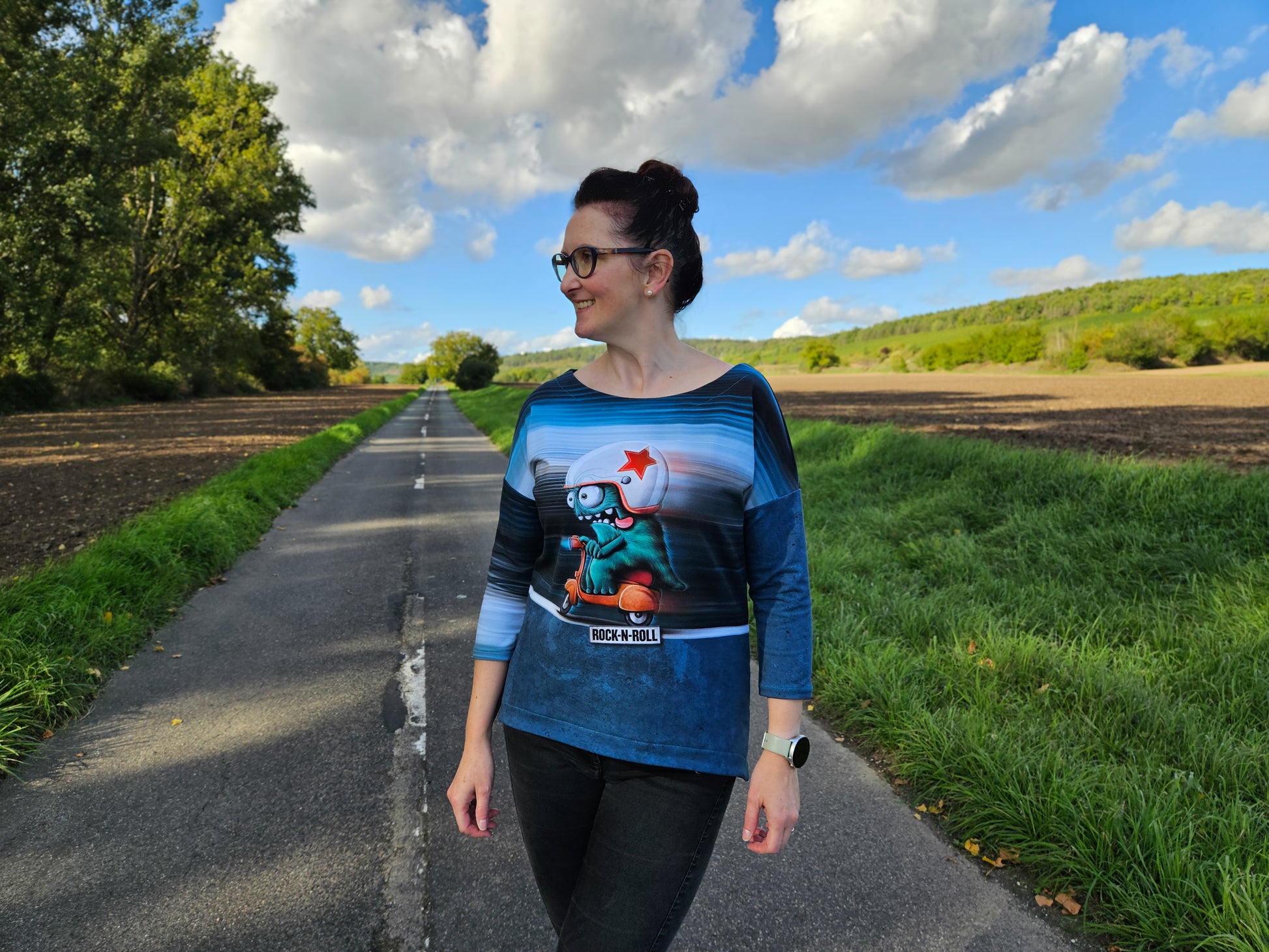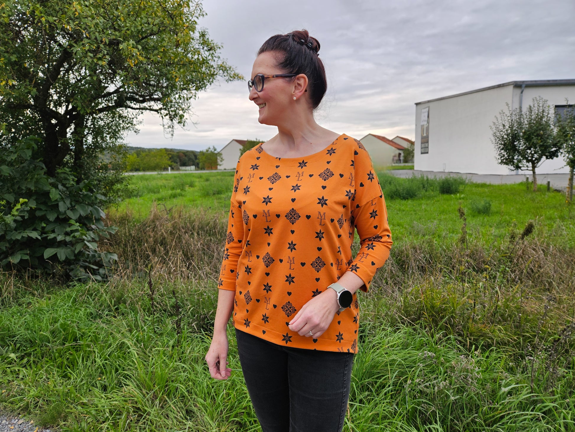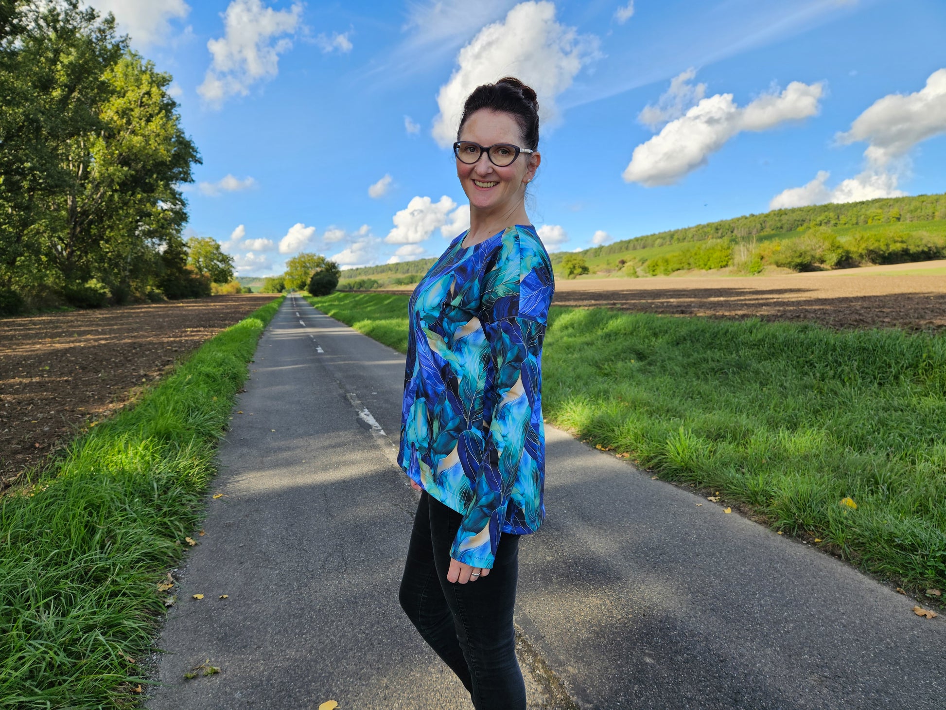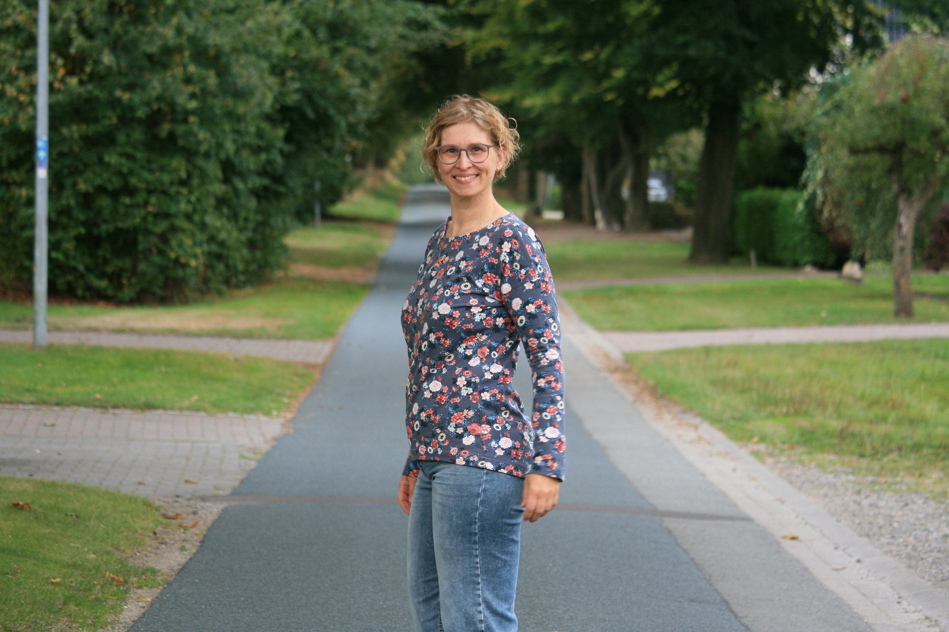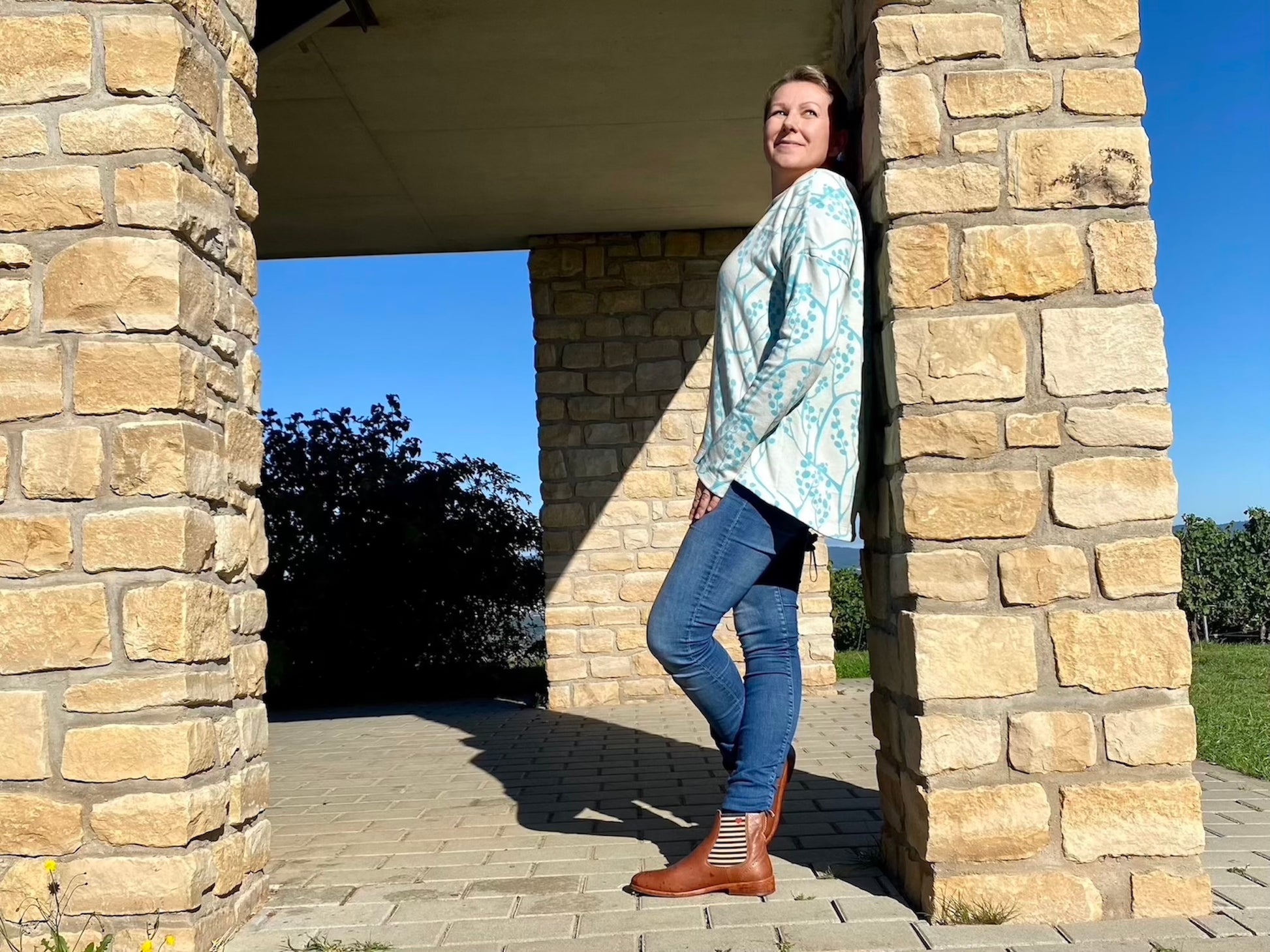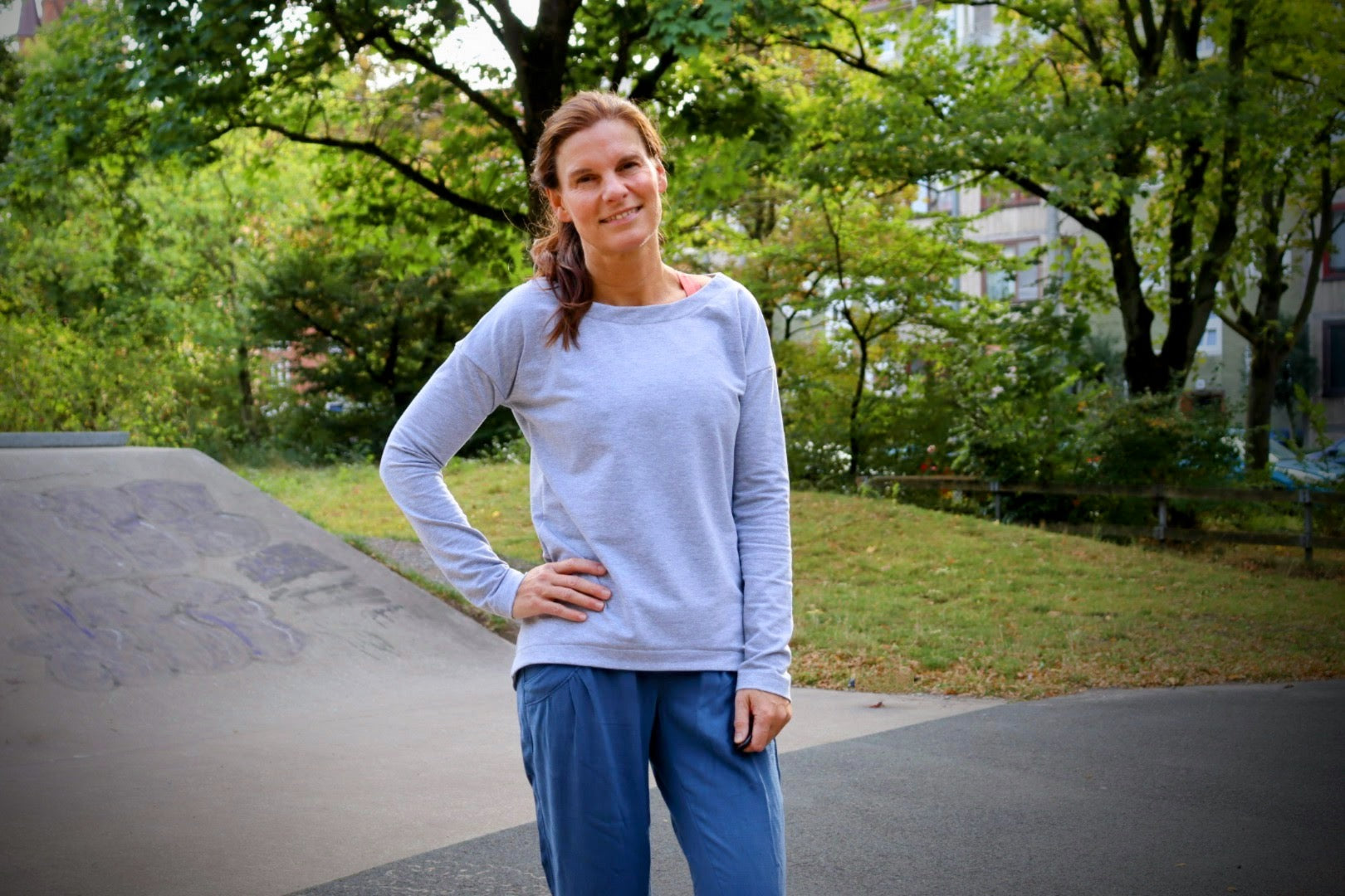 Der Schnitt ist ausgelegt auf Stoffe wie French Terry, Strickstoffe, Waffelstrick, festere Baumwolljerseys und Jacquard-Stoffe.