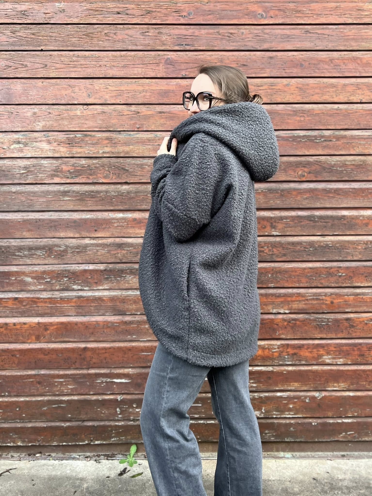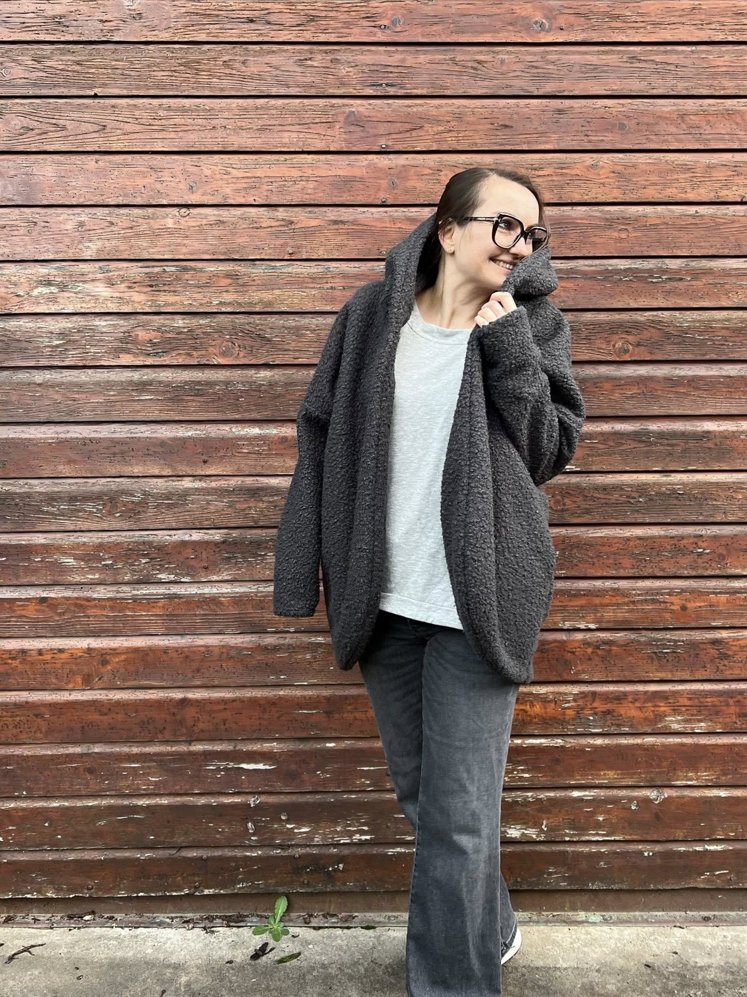 Der Schnitt ist ausgelegt auf dickere Stoffe wie Heavy Sweat, Sherpa, Fleece, Bouclé, Wollwalk, aber auch French Terry und Jacquard.